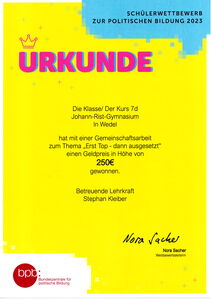 Die Klasse 7d hat einen Geldpreis von 250€ beim Schülerwettbewerb der Bundeszentrale für politische Bildung gewonnen. An dem Wettbewerb nehmen jedes Jahr knapp 2000...