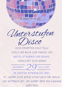 am Freitag, den 29.11.2024 findet von 18 bis 21 Uhr wieder die gewohnte Herbst-Winter-Unterstufendisco statt!