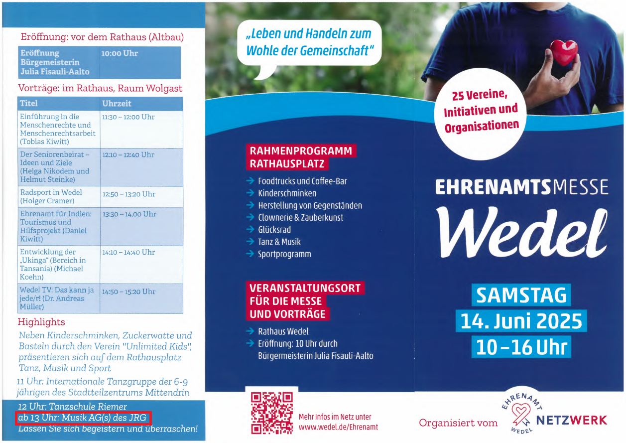 Am Samstag, den 14.06. findet in Wedel die Ehrenamtsmesse statt. Im Rahmenprogramm spielt ab 13:00 die BigBand des JRG.
