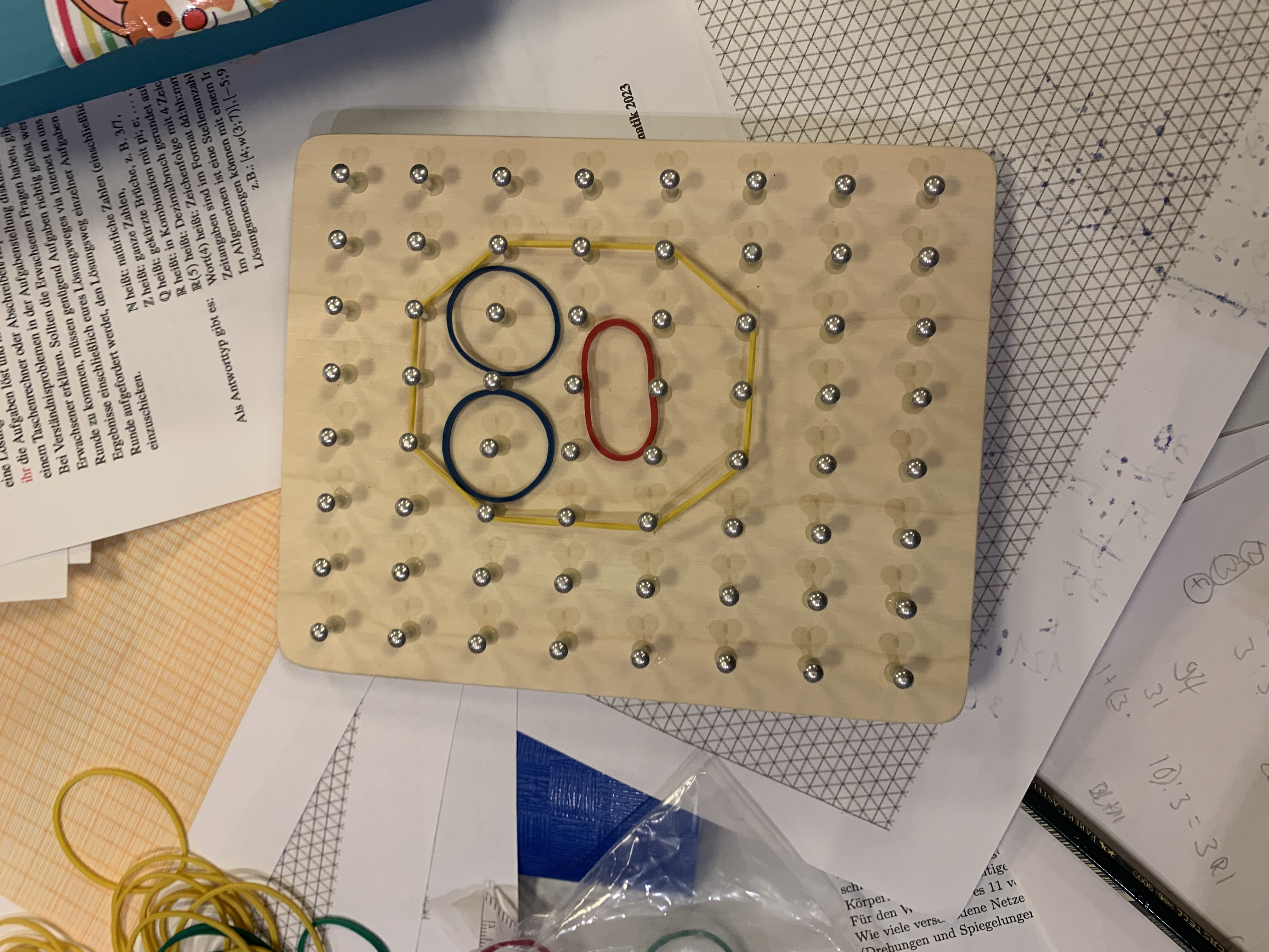 a) Eingeschränkte Teilnahme: Aus den Jahrgängen 7; 9 und 10 fanden sich leider nicht genügend Eltern, die bereit waren, im Organisationsteam mitzuarbeiten. So durften nur die 5; 6, 8, und Oberstufen-Klassen mitmachen. Dennoch fanden sich fast 30 Mathe-Gruppen mit ca. 70 Jugendlichen in der Aula zusammen und waren mit Begeisterung am Rechnen, Basteln und Knobeln, wetteiferten mit- und gegeneinander und freuten und ärgerten sich gemeinsam über richtige und falsche Lösungen.