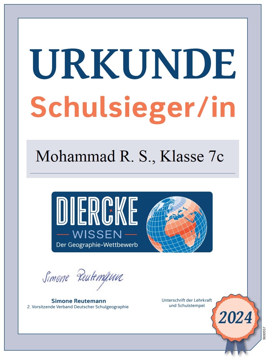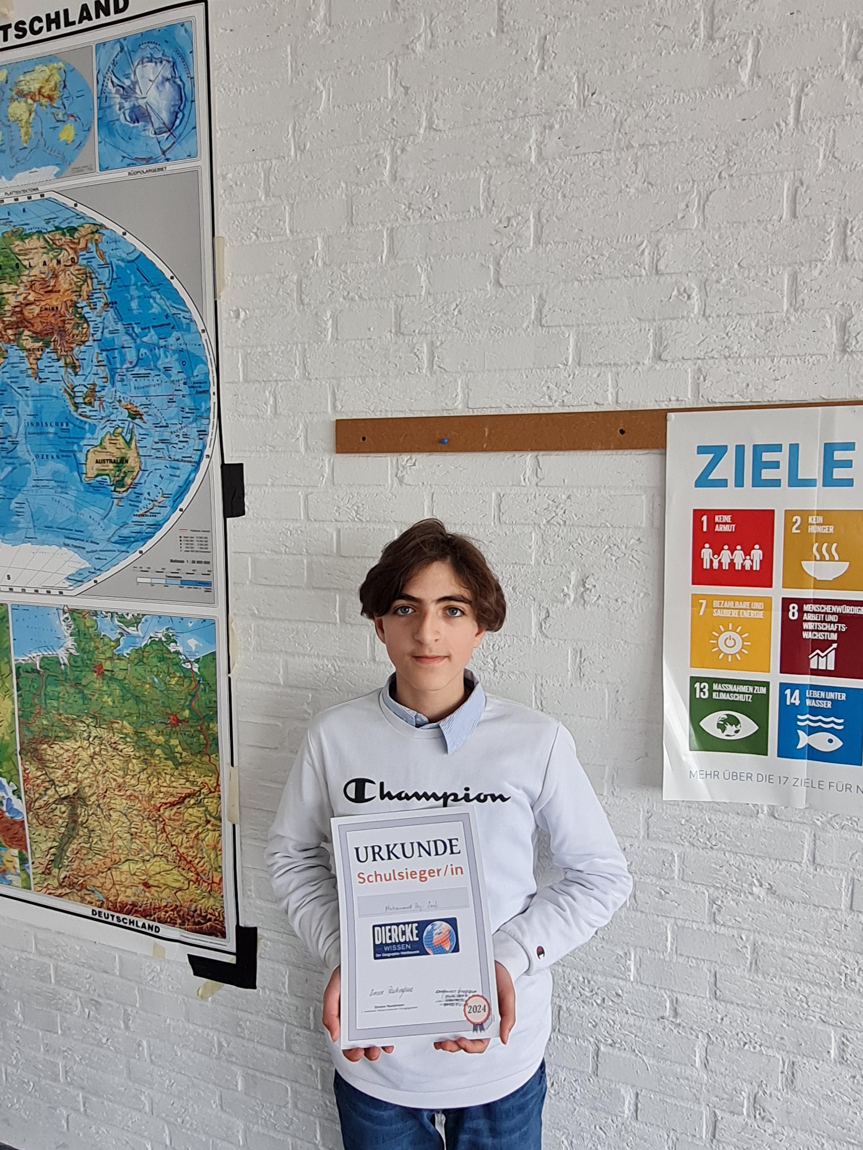 Diercke Wissen 2024 - Raji S., Klasse 7c ist Schulsieger