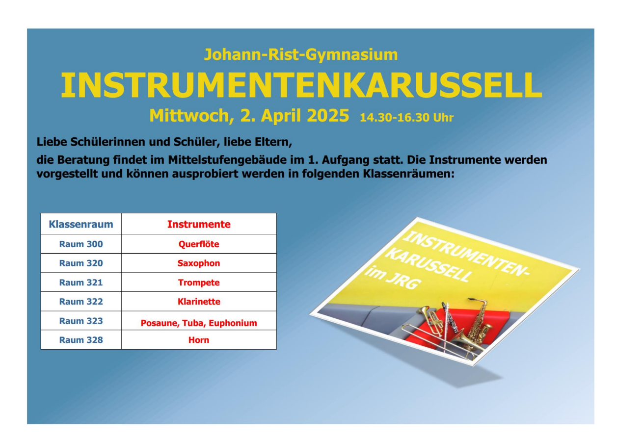 Am Mittwoch, den 2. April 2025 laden wir alle, die sich für das Bläserensemble angemeldet haben und alle, die sich für dieses Angebot interessieren von 14:30 - 16:30 Uhr in das Johann-Rist-Gymnasium ganz herzlich zu einem Instrumentenkarussell ein.