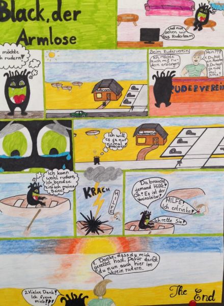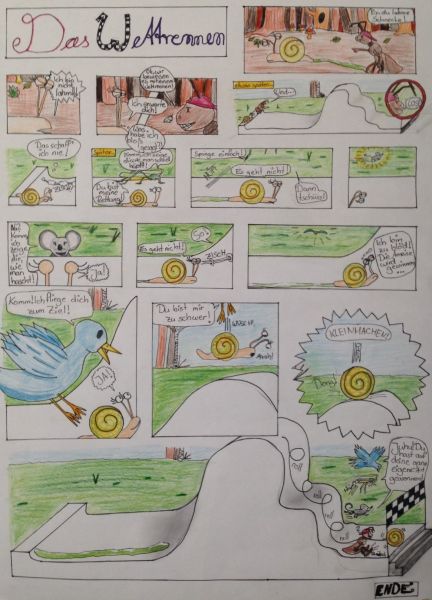 und unter Berücksichtigung der verschiedenen Besonderheiten einer Comic-Zeichnung wie etwa Einstellungsgrößen, Mimik, Gestik, Verteilung der Panels, Geräuschwörter und Aufbau der Spannung schufen die Schülerinnen und Schüler eigene Comics, von denen einige hier zu sehen sind.