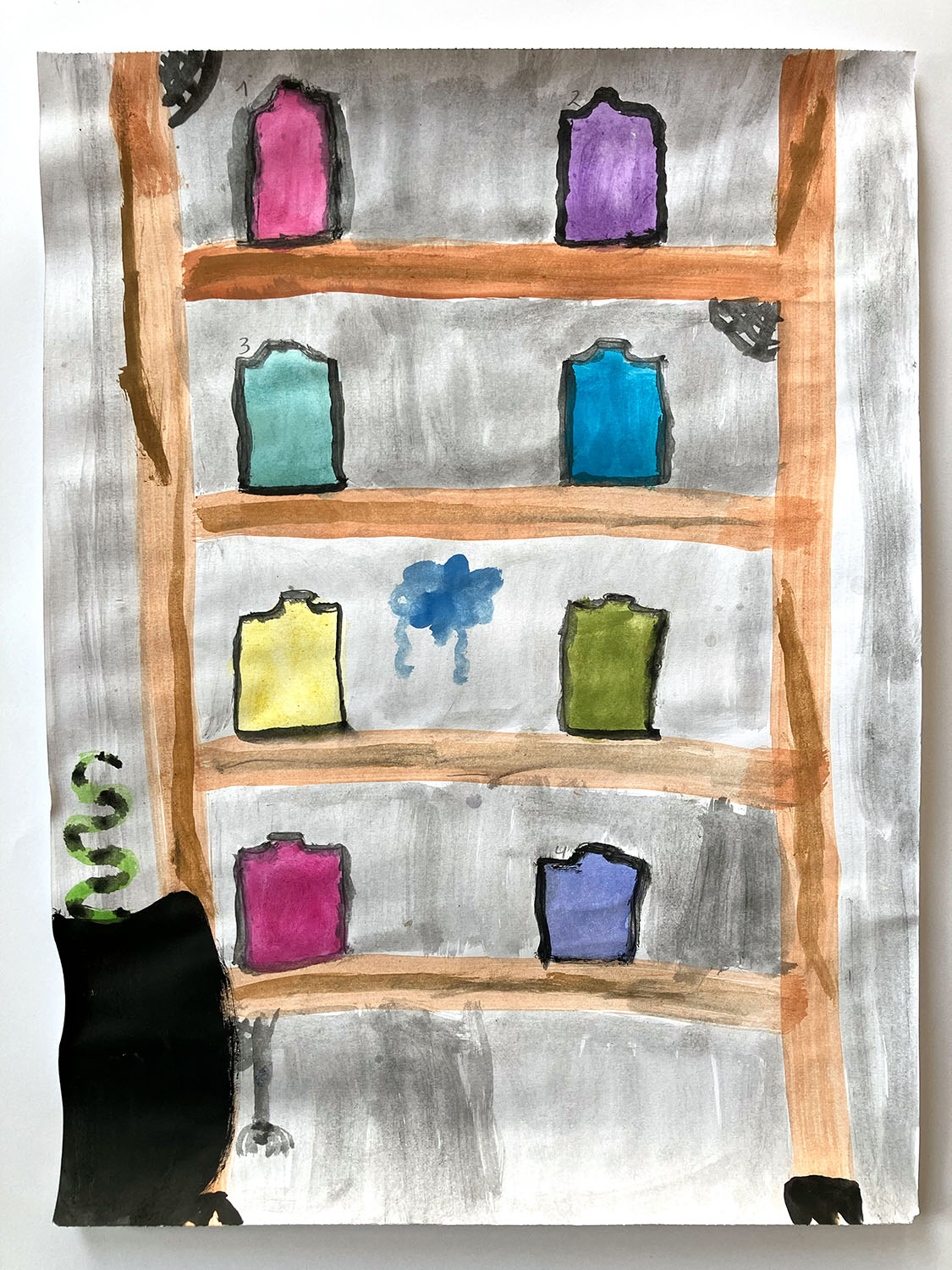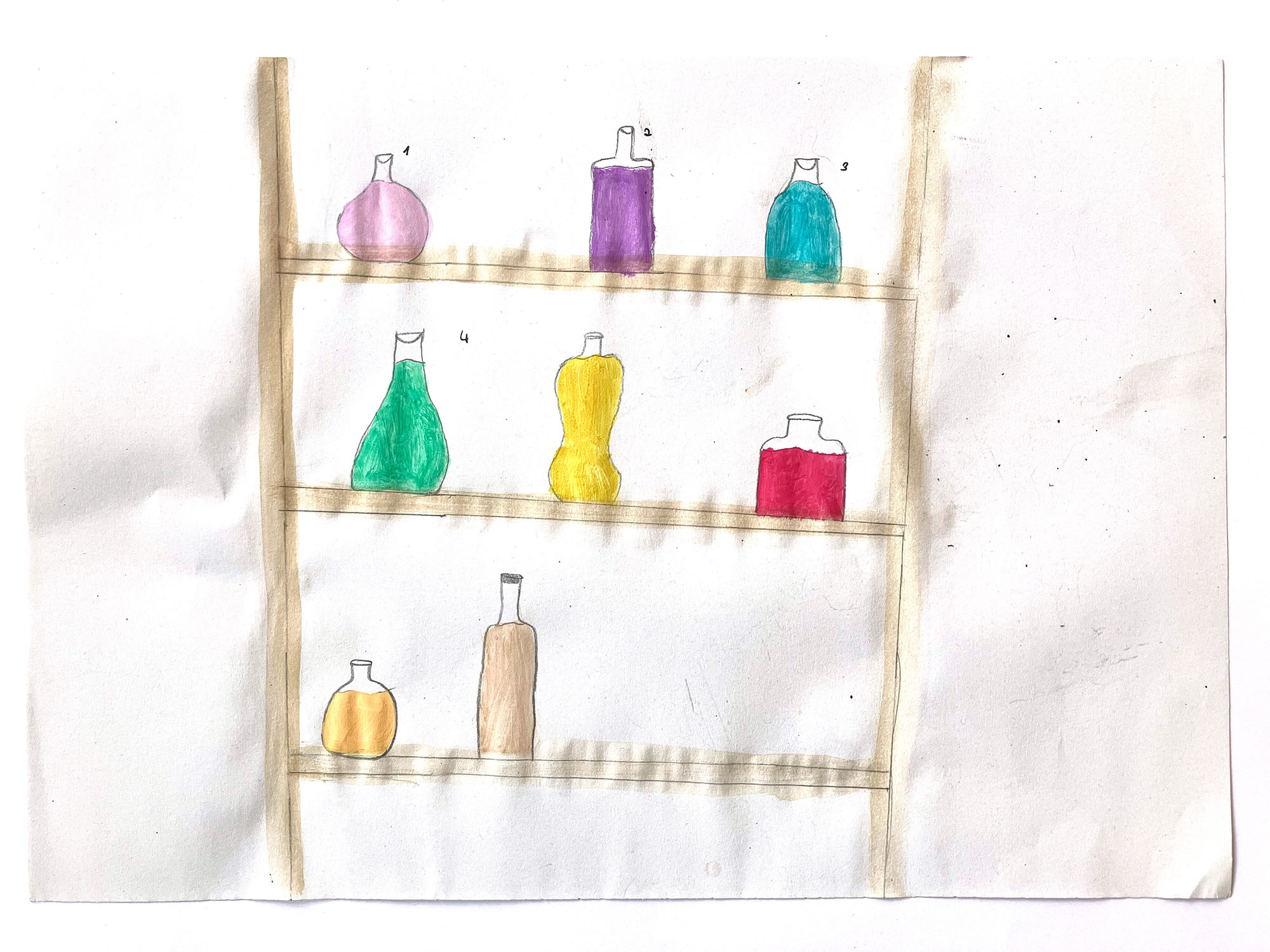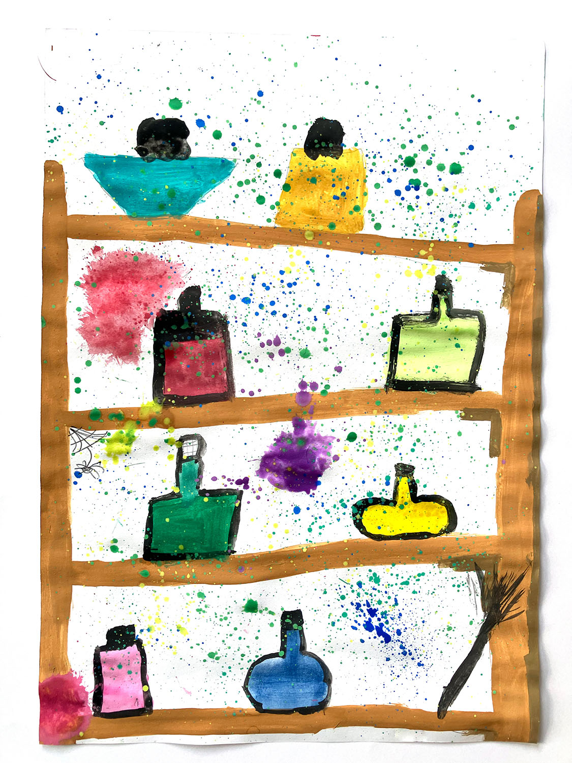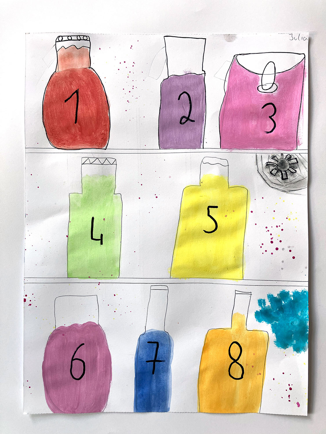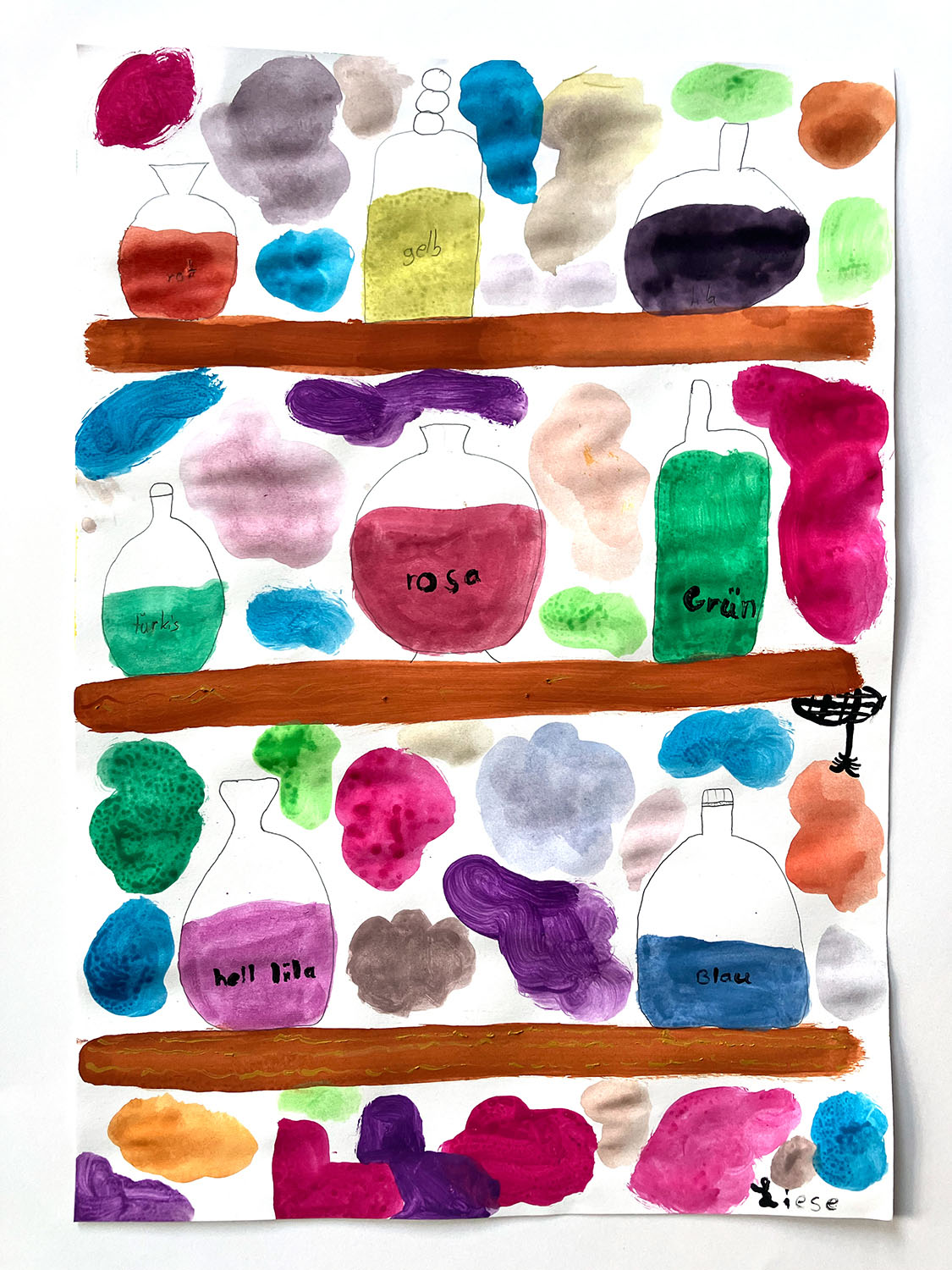 Zu Beginn der Einheit wurde die Geschichte der Zauberin Zeralda vorgelesen, deren Farbwerkstatt von einem Sturm zerstört wurde. Sie wendete sich in einem Brief an die Klasse mit der Bitte, die Farbwerkstatt wieder mit Farben zu füllen. So haben die Schülerinnen und Schüler zu Ende der Einheit erst schriftlich ausgearbeitet, wie ihre Farben aussehen, schmecken, riechen, klingen und vor allem wirken sollen. Im Anschluss wurden die Farbregale der Zauberin Zeralda gemalt.