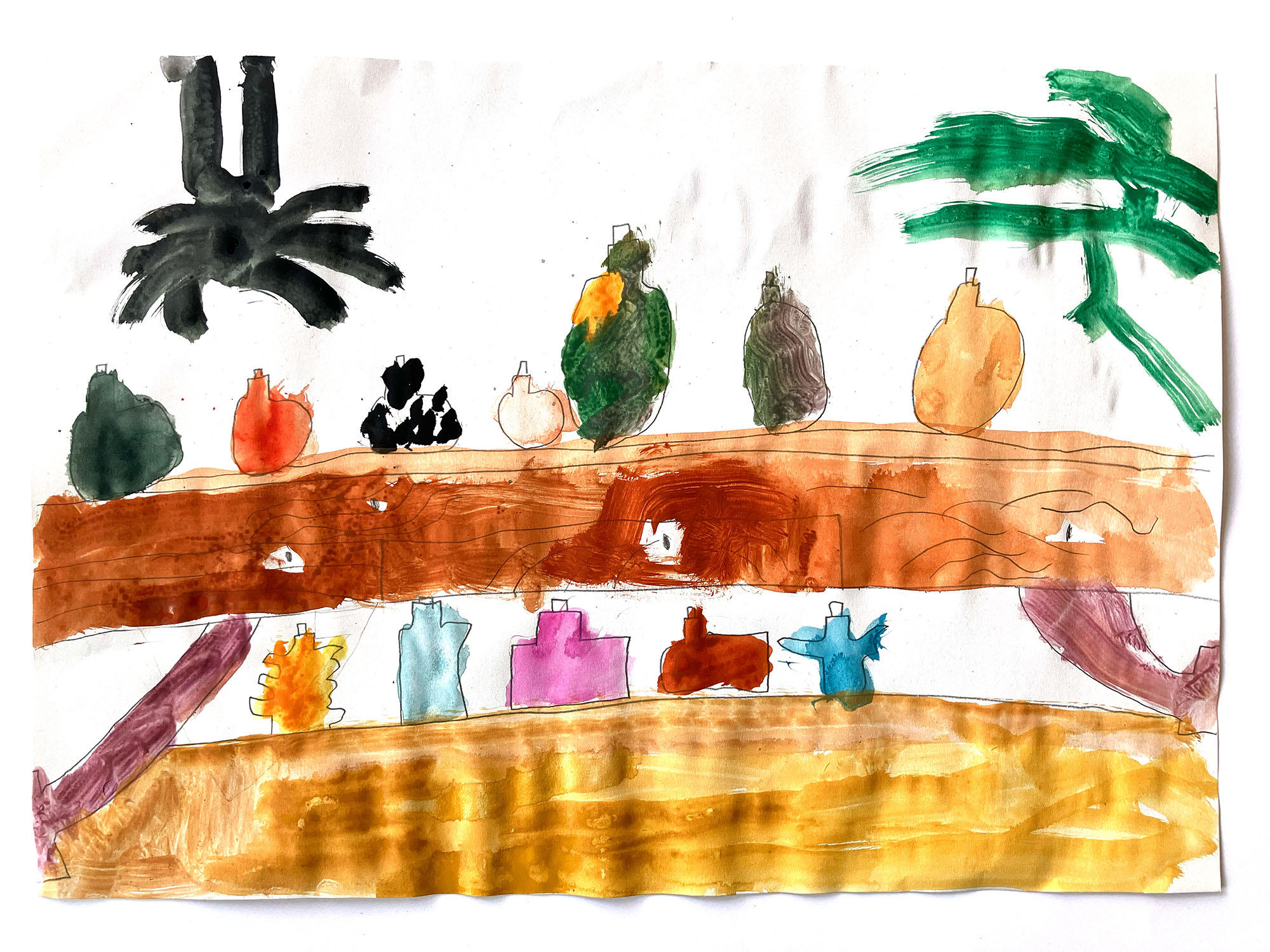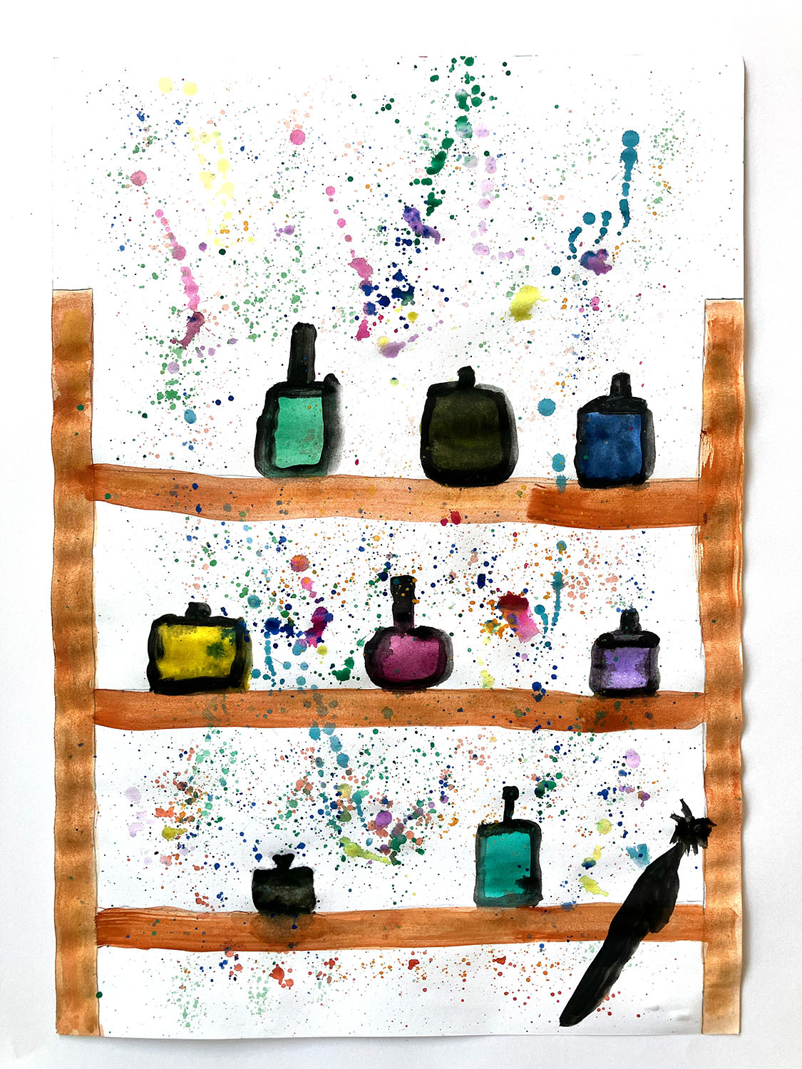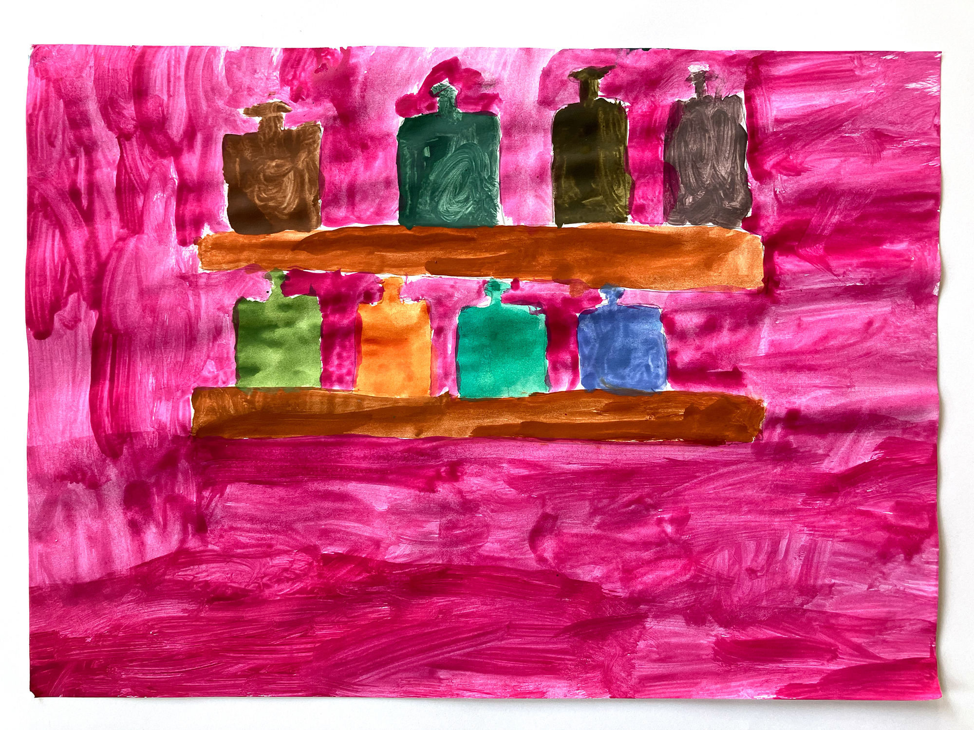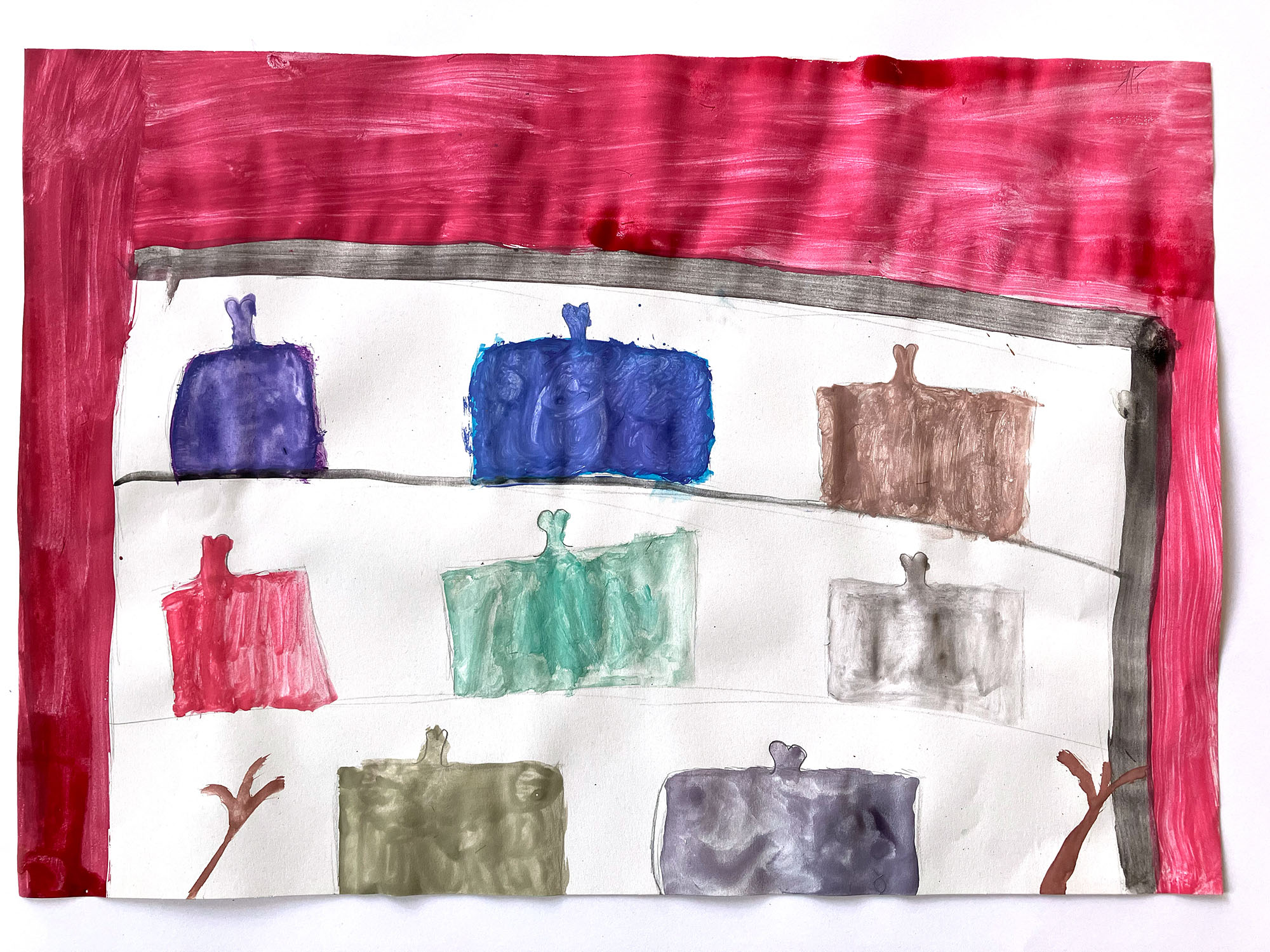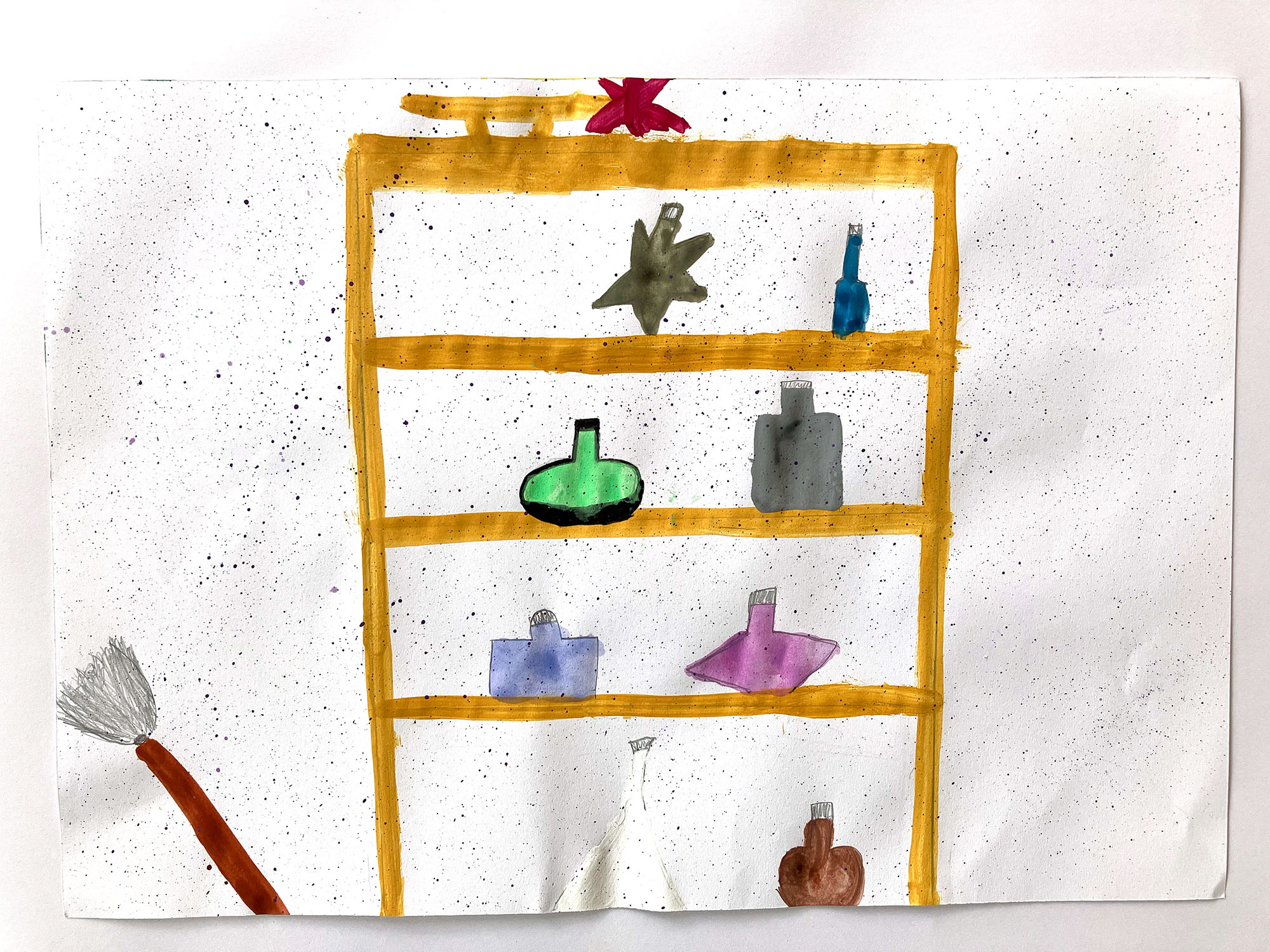 Zu Beginn der Einheit wurde die Geschichte der Zauberin Zeralda vorgelesen, deren Farbwerkstatt von einem Sturm zerstört wurde. Sie wendete sich in einem Brief an die Klasse mit der Bitte, die Farbwerkstatt wieder mit Farben zu füllen. So haben die Schülerinnen und Schüler zu Ende der Einheit erst schriftlich ausgearbeitet, wie ihre Farben aussehen, schmecken, riechen, klingen und vor allem wirken sollen. Im Anschluss wurden die Farbregale der Zauberin Zeralda gemalt.