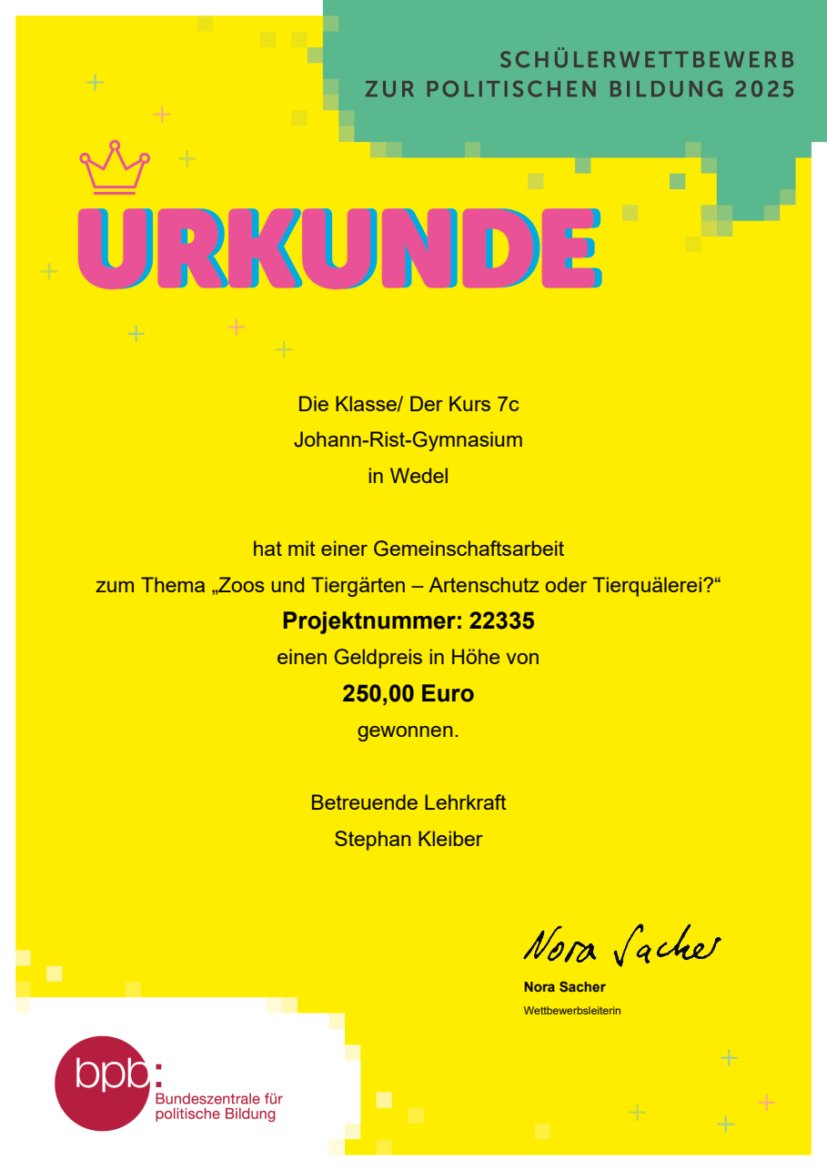 Die Klasse 7c hat einen Geldpreis von 250€ beim Schülerwettbewerb der Bundeszentrale für politische Bildung gewonnen. An dem Wettbewerb nehmen jedes Jahr über 1500 Schulklassen aus ganz Deutschland und der Welt teil.