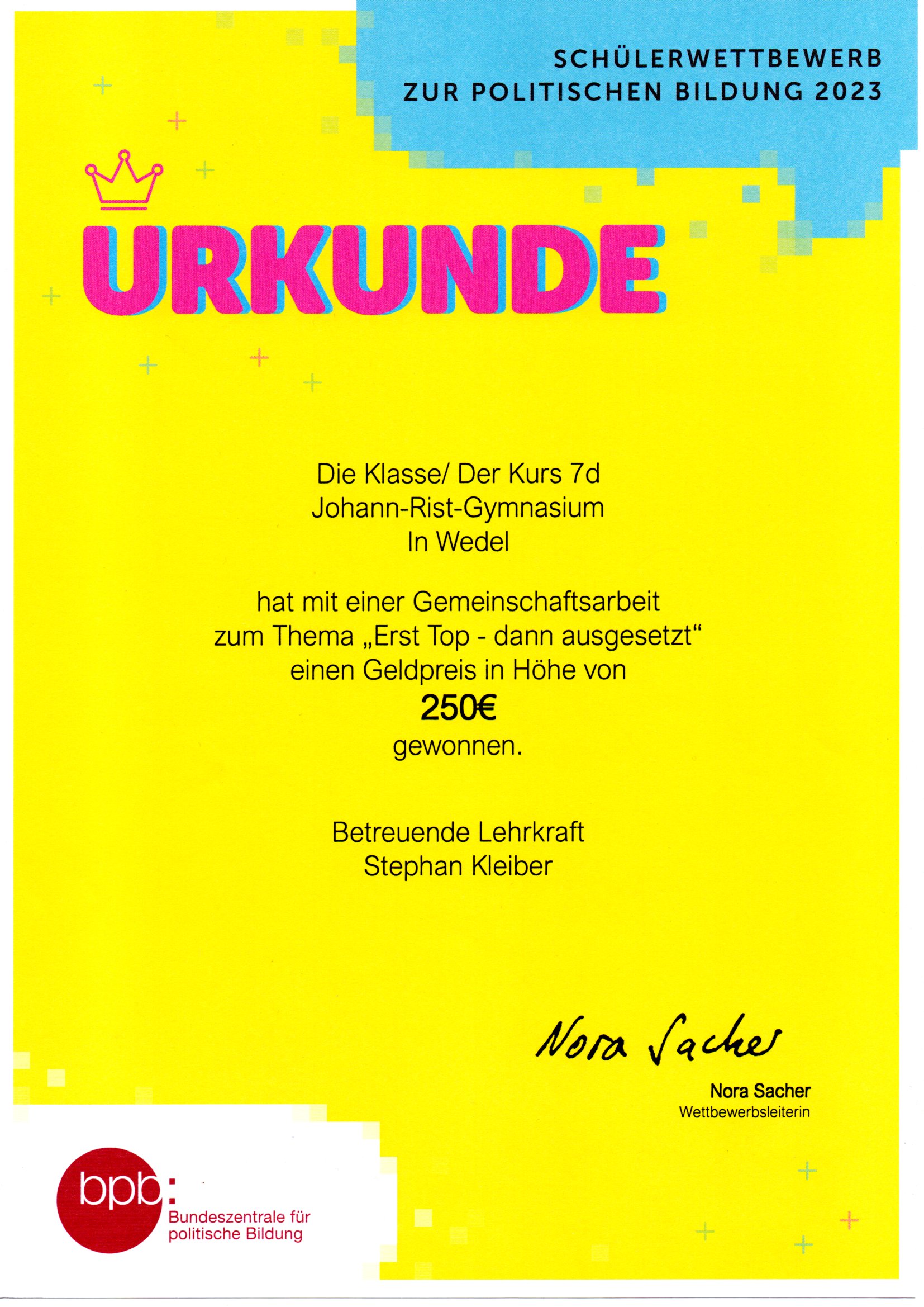 Die Klasse 7d hat einen Geldpreis von 250€ beim Schülerwettbewerb der Bundeszentrale für politische Bildung gewonnen. An dem Wettbewerb nehmen jedes Jahr knapp 2000 Schulklassen aus ganz Deutschland und der Welt teil.