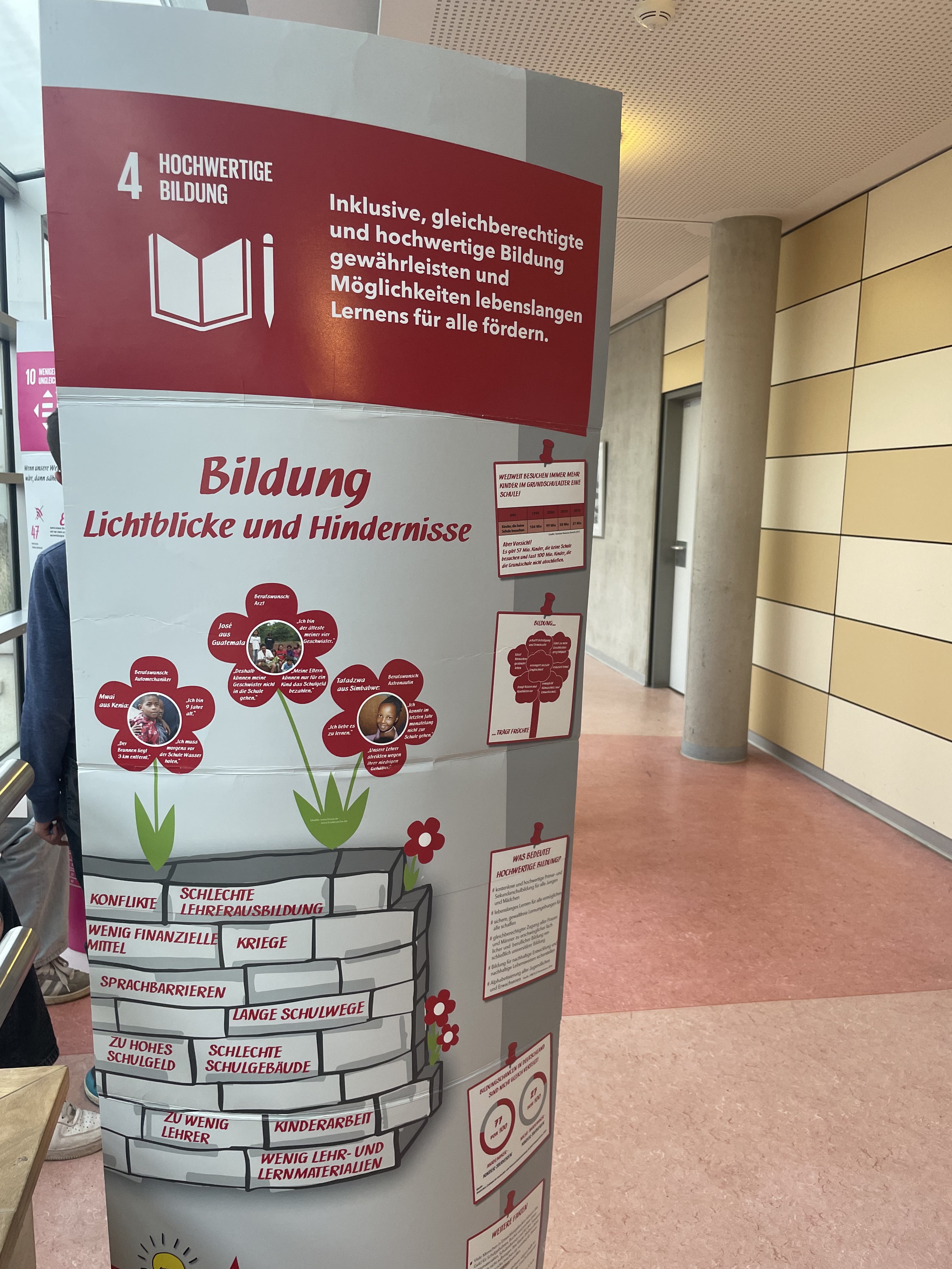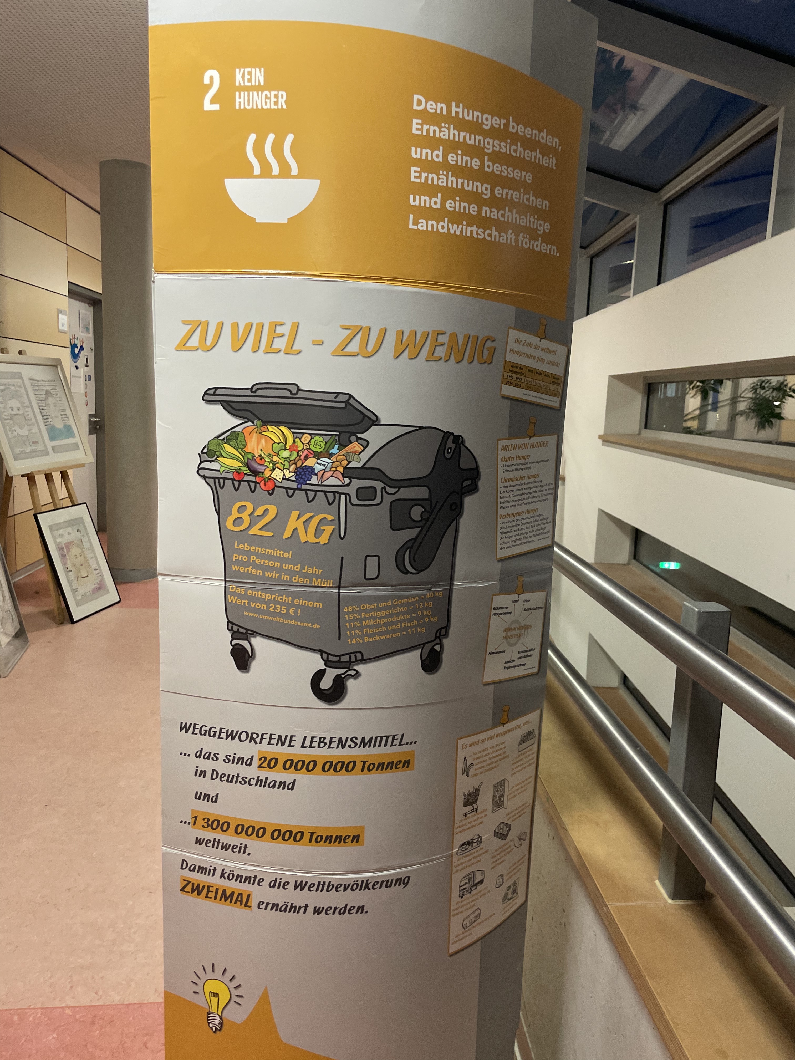 Unser Ziel ist es, darauf aufmerksam zu machen, dass wir alle etwas verändern müssen und wir alle unseren Beitrag dazu leisten können. Zu jedem SDG-Ziel gab es in unserer Ausstellung einen Aufsteller mit wichtigen Informationstexten. Beeindruckt haben uns diese Fakten: