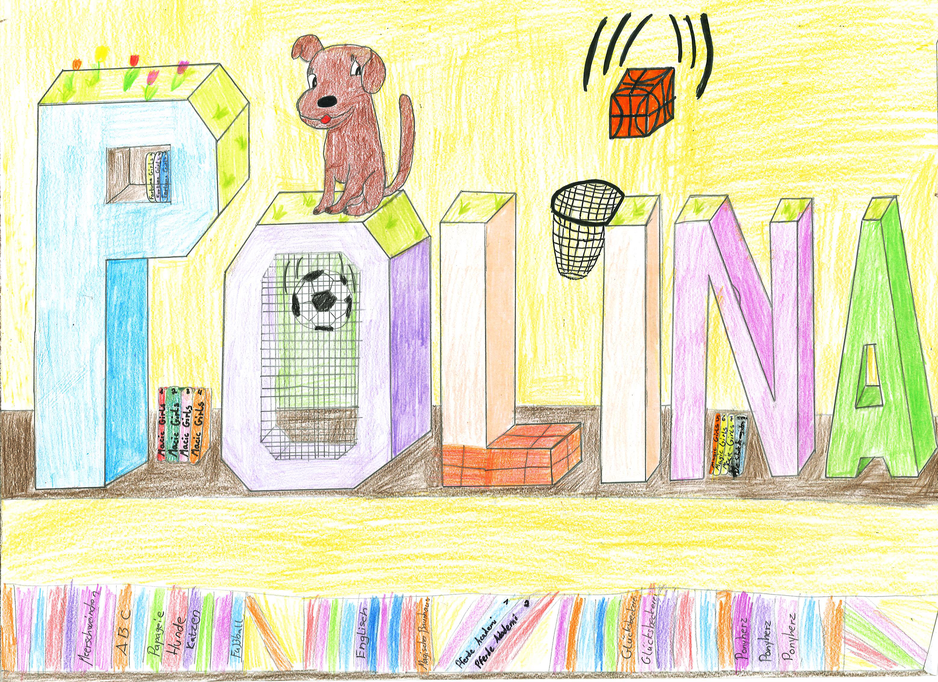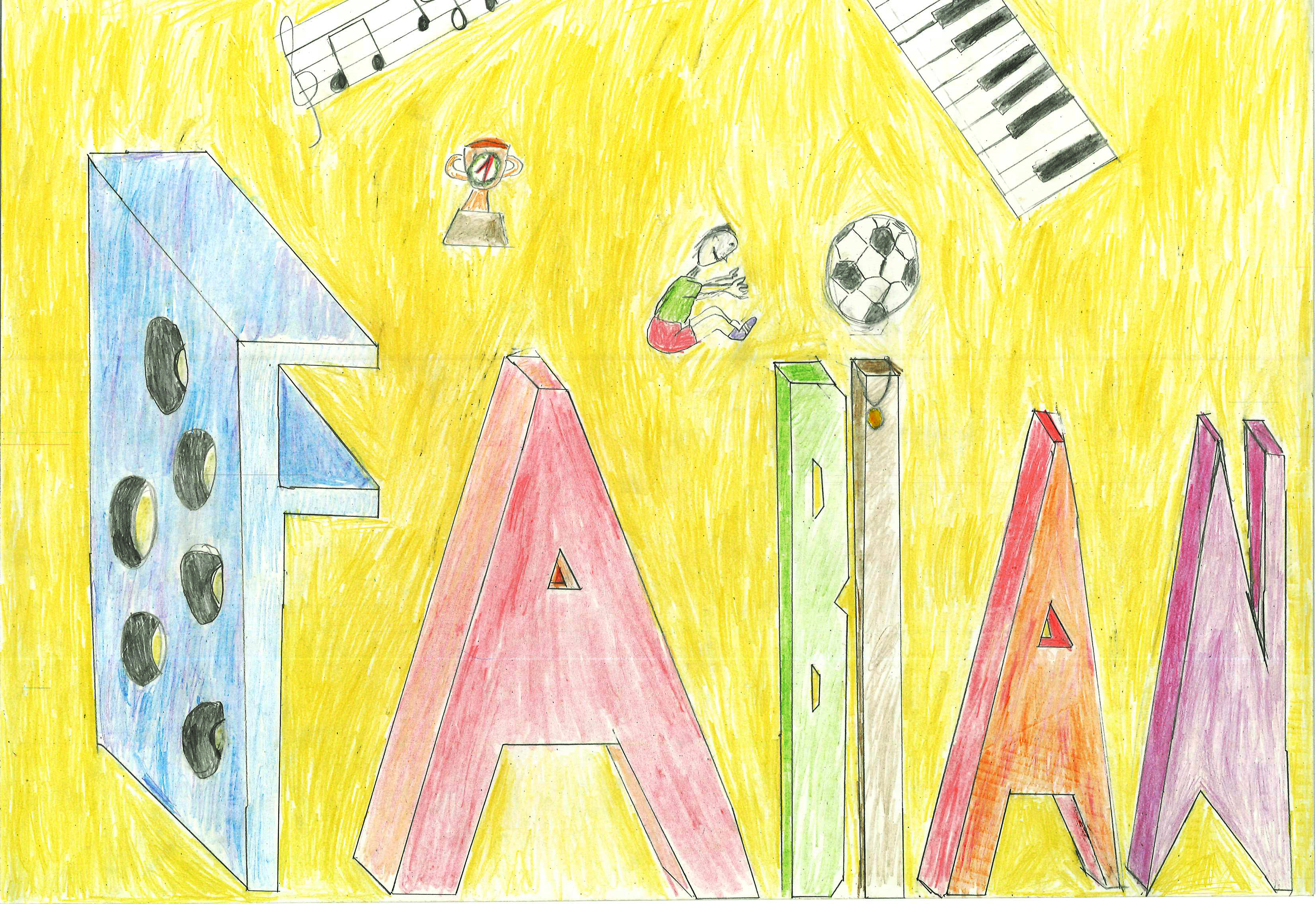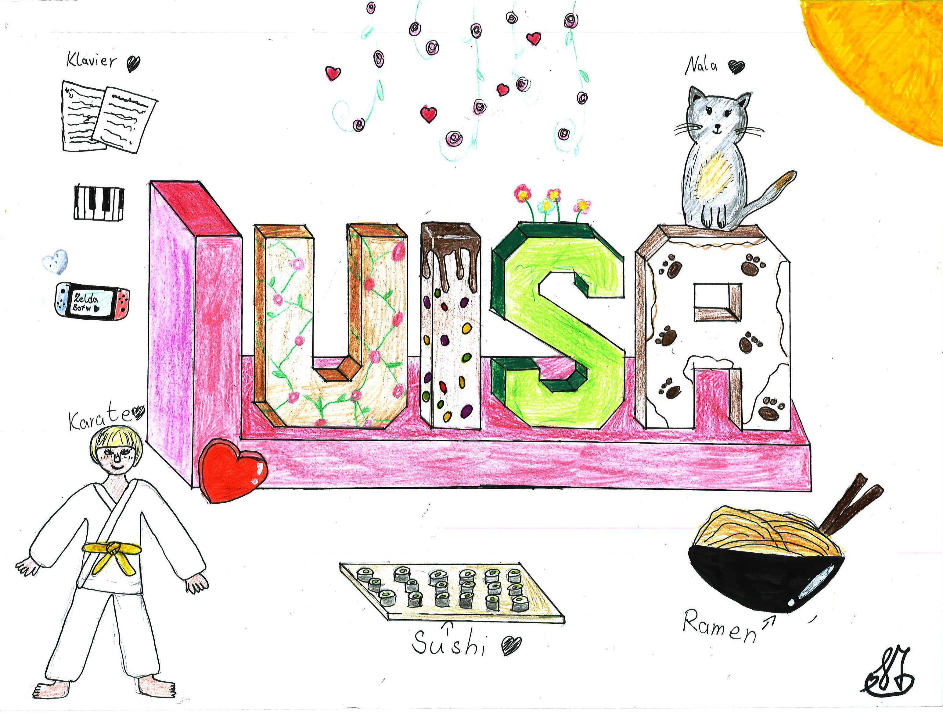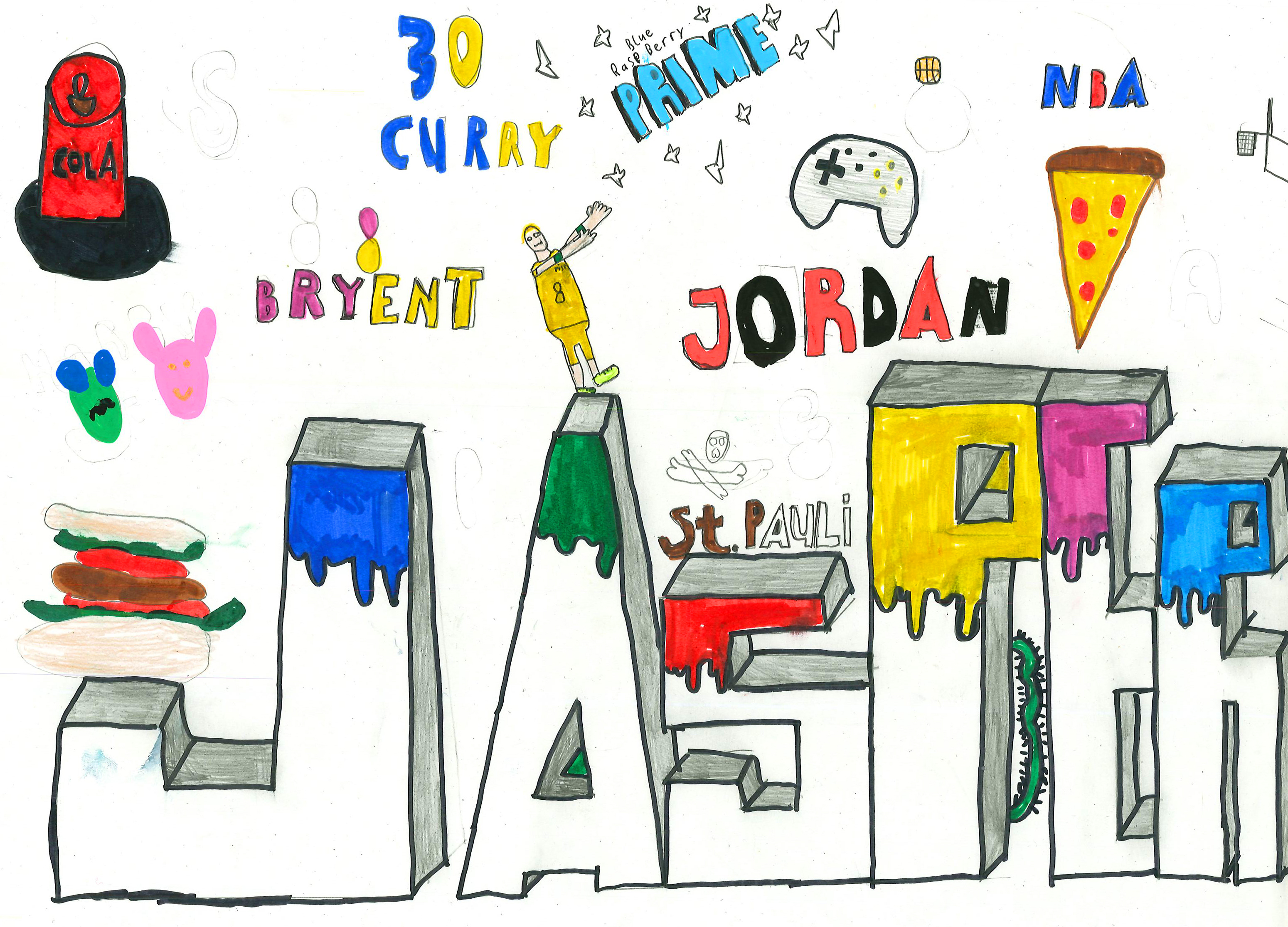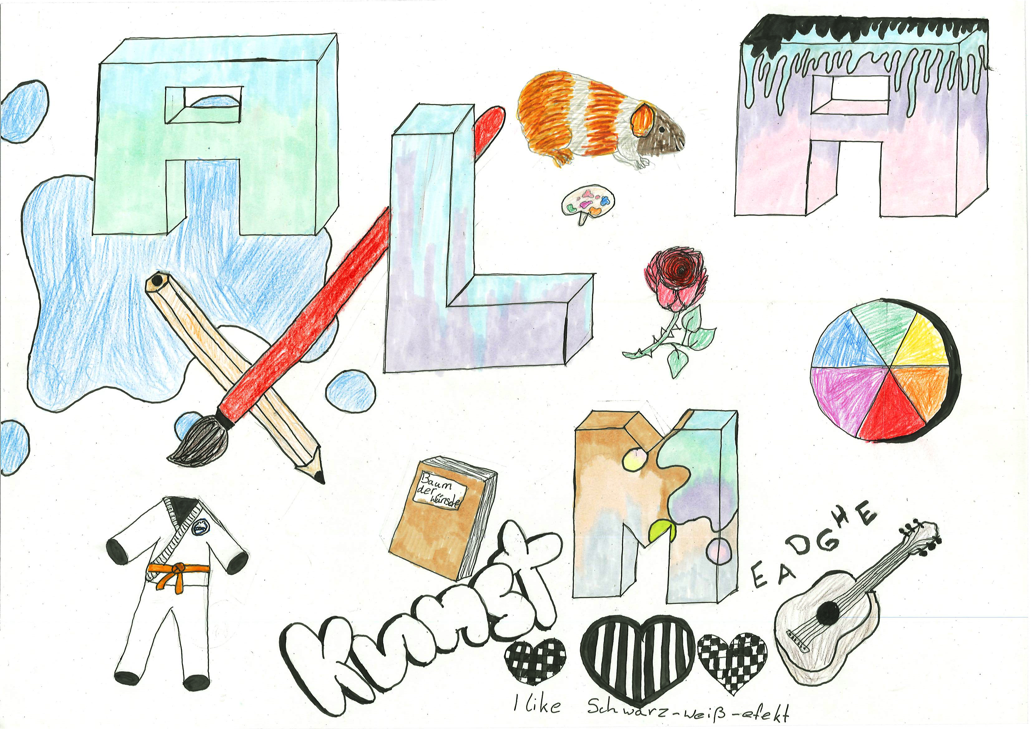 Die Aufgabe im Kunstunterricht der Klassen 5c und 5d bestand darin, den eigenen Namen in Parallelperspektive zu konstruieren. Nachdem dies geübt wurde, haben die Kinder den Namen auf ein größeres Blatt übertragen. Dazu sollten ergänzend mindestens zwei Dinge gezeichnet werden, die die eigene Persönlichkeit ausmachen. Auch die Art und Weise der Darstellung gab Auskunft über den Charakter.