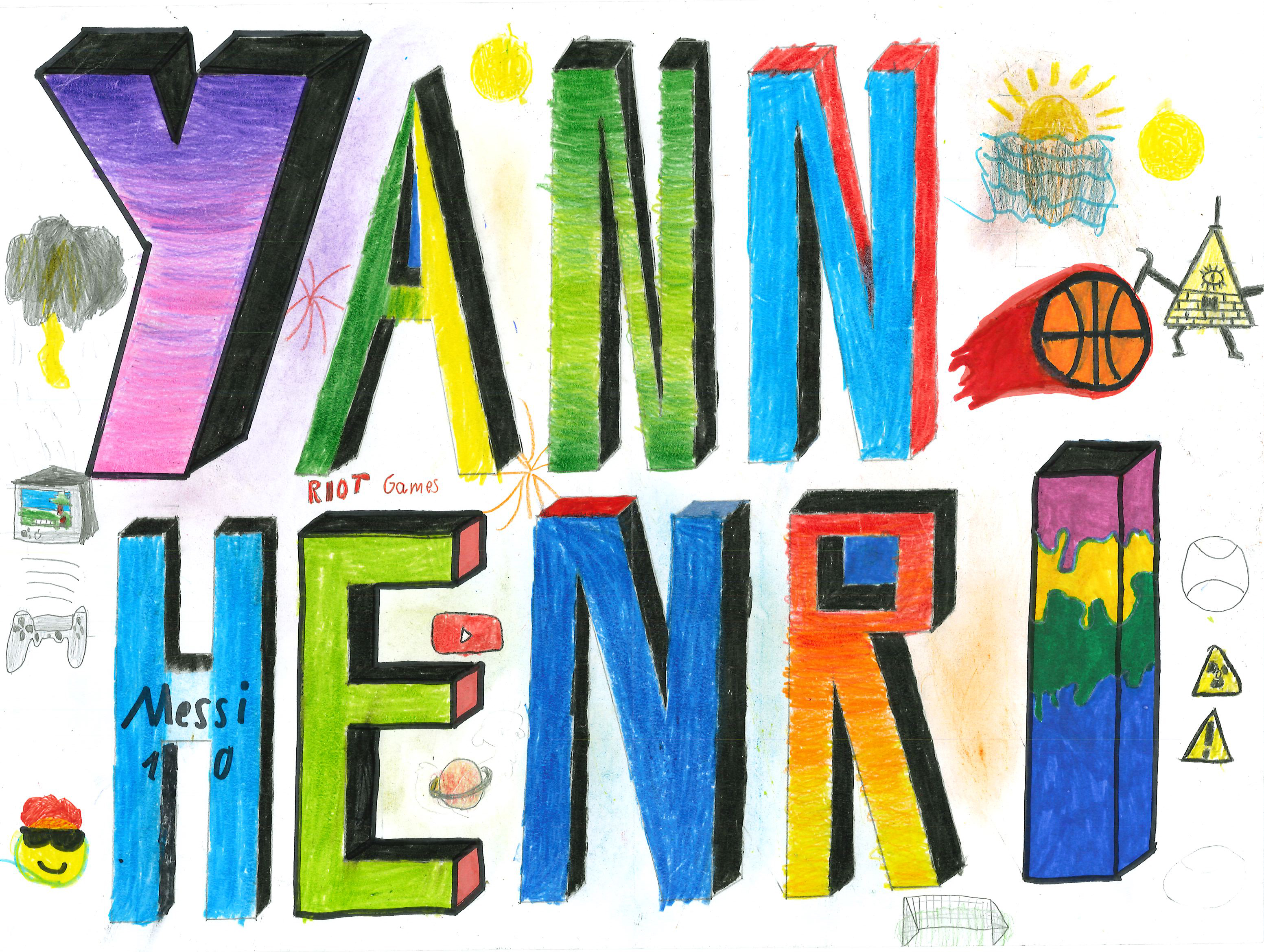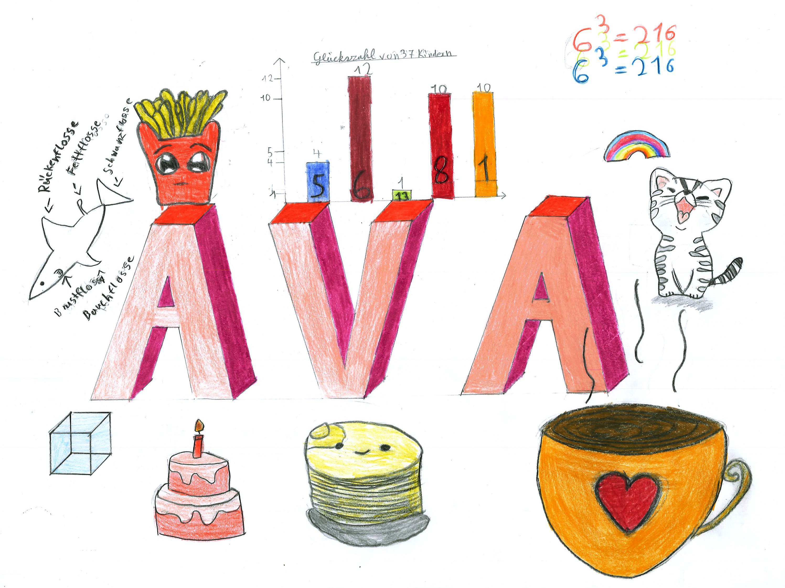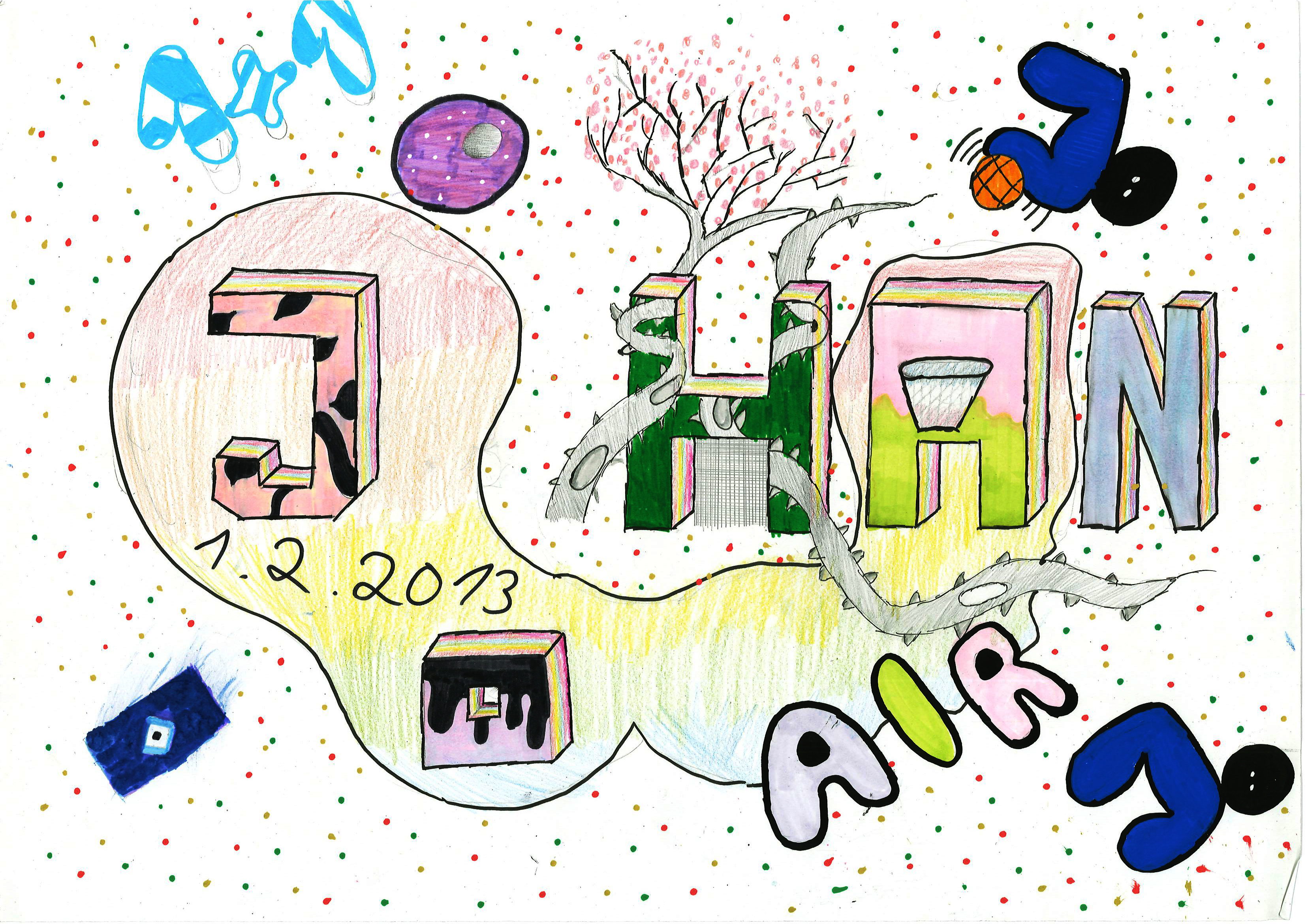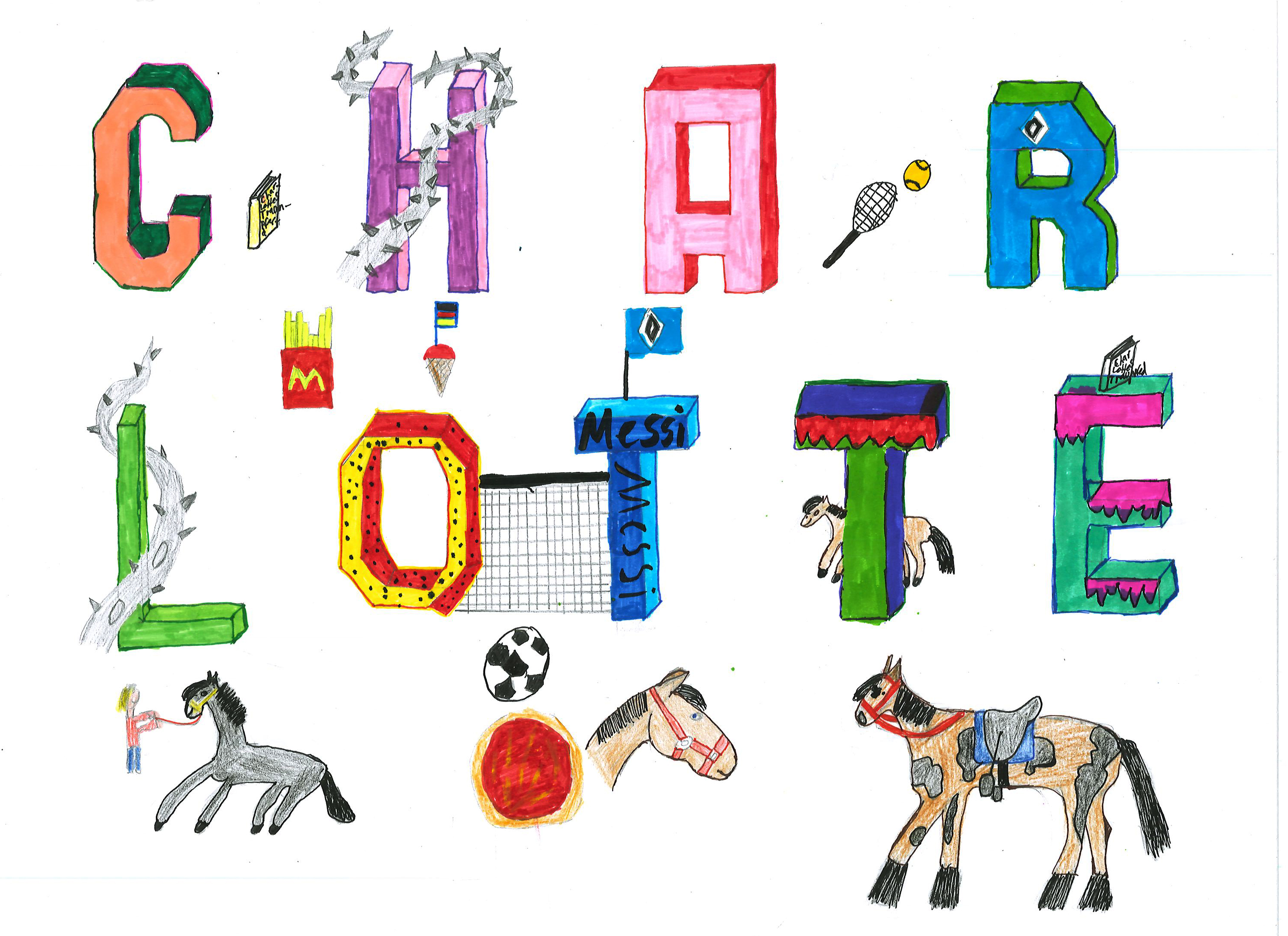 Die Aufgabe im Kunstunterricht der Klassen 5c und 5d bestand darin, den eigenen Namen in Parallelperspektive zu konstruieren. Nachdem dies geübt wurde, haben die Kinder den Namen auf ein größeres Blatt übertragen. Dazu sollten ergänzend mindestens zwei Dinge gezeichnet werden, die die eigene Persönlichkeit ausmachen. Auch die Art und Weise der Darstellung gab Auskunft über den Charakter.