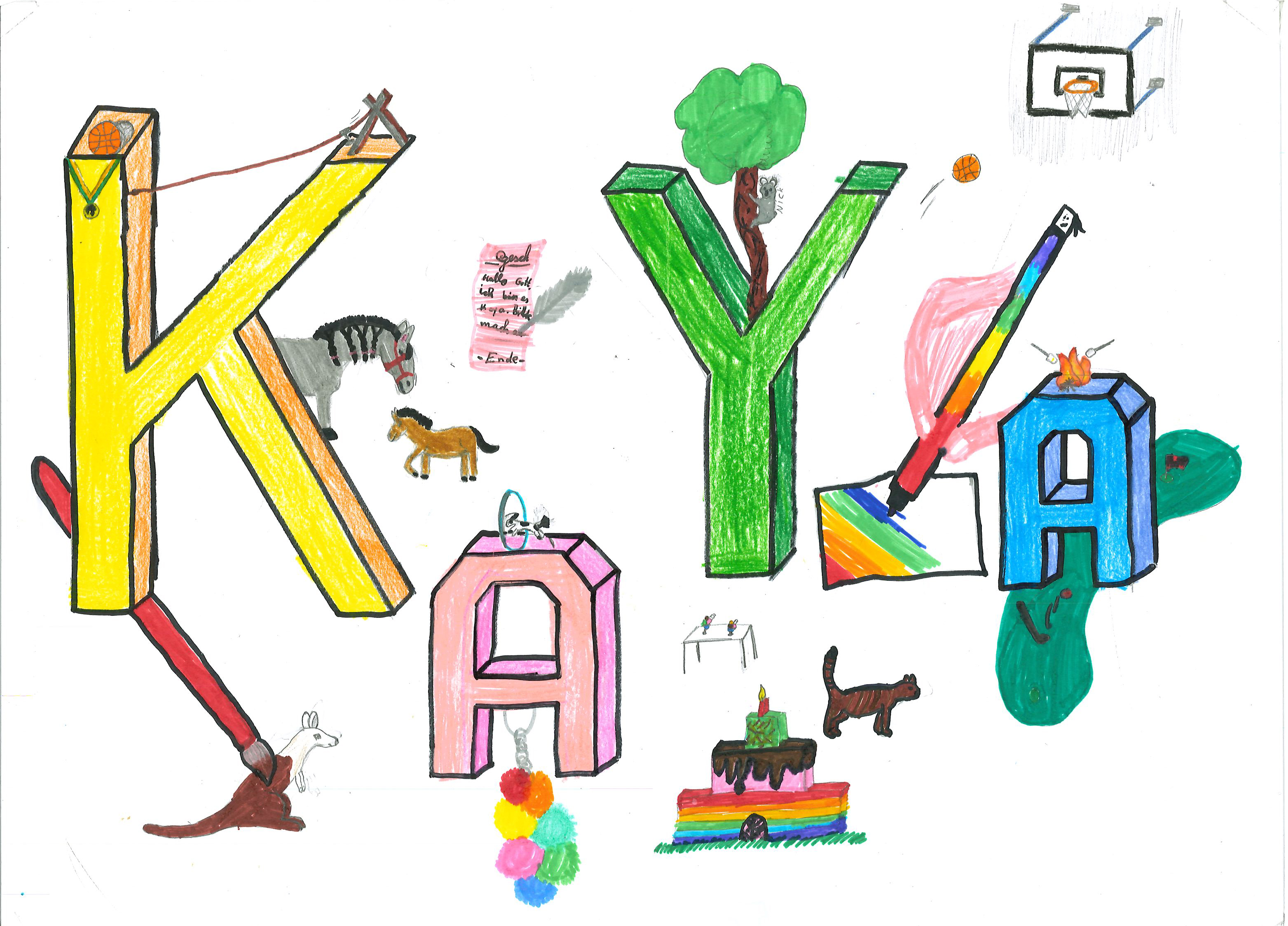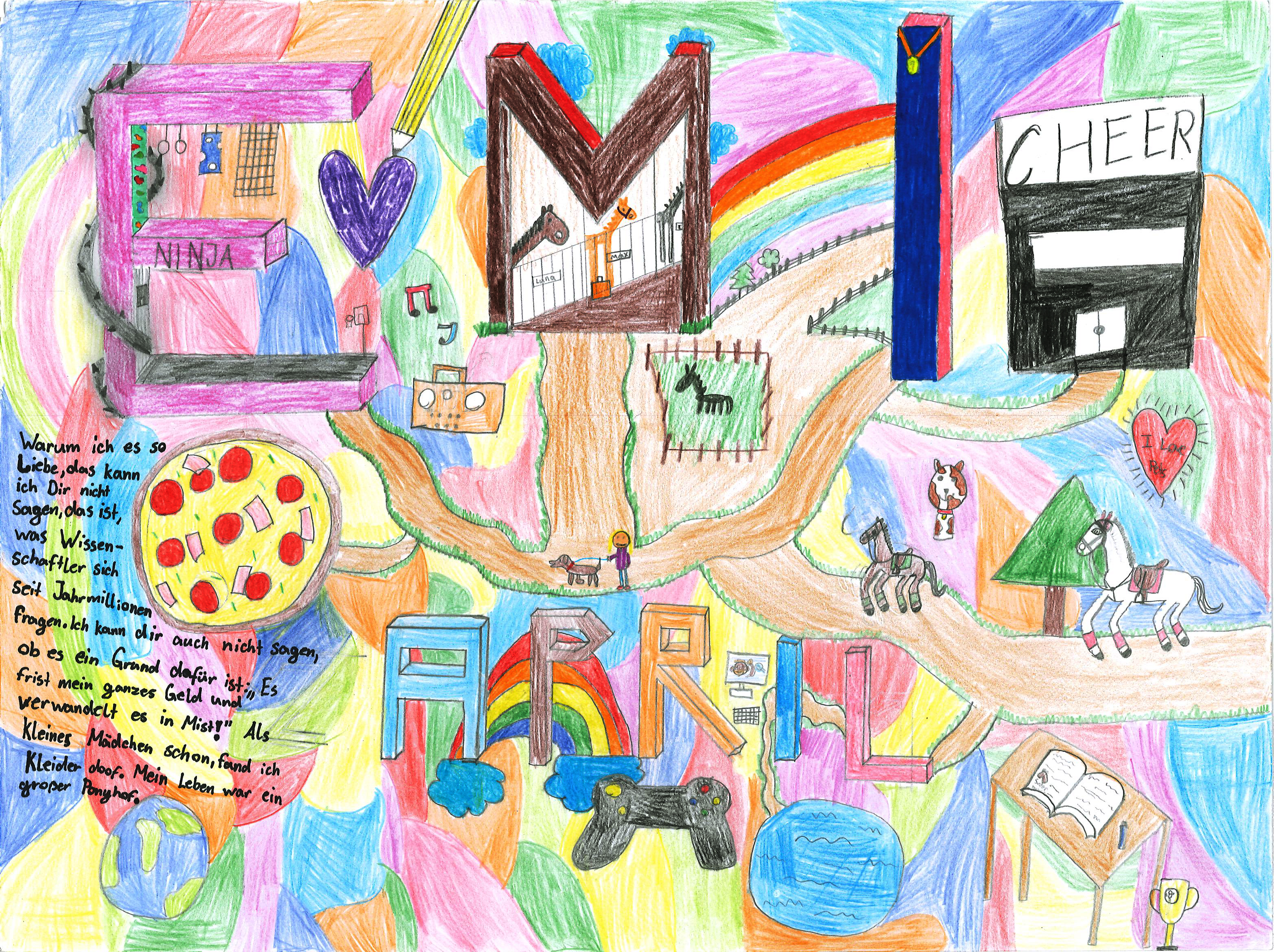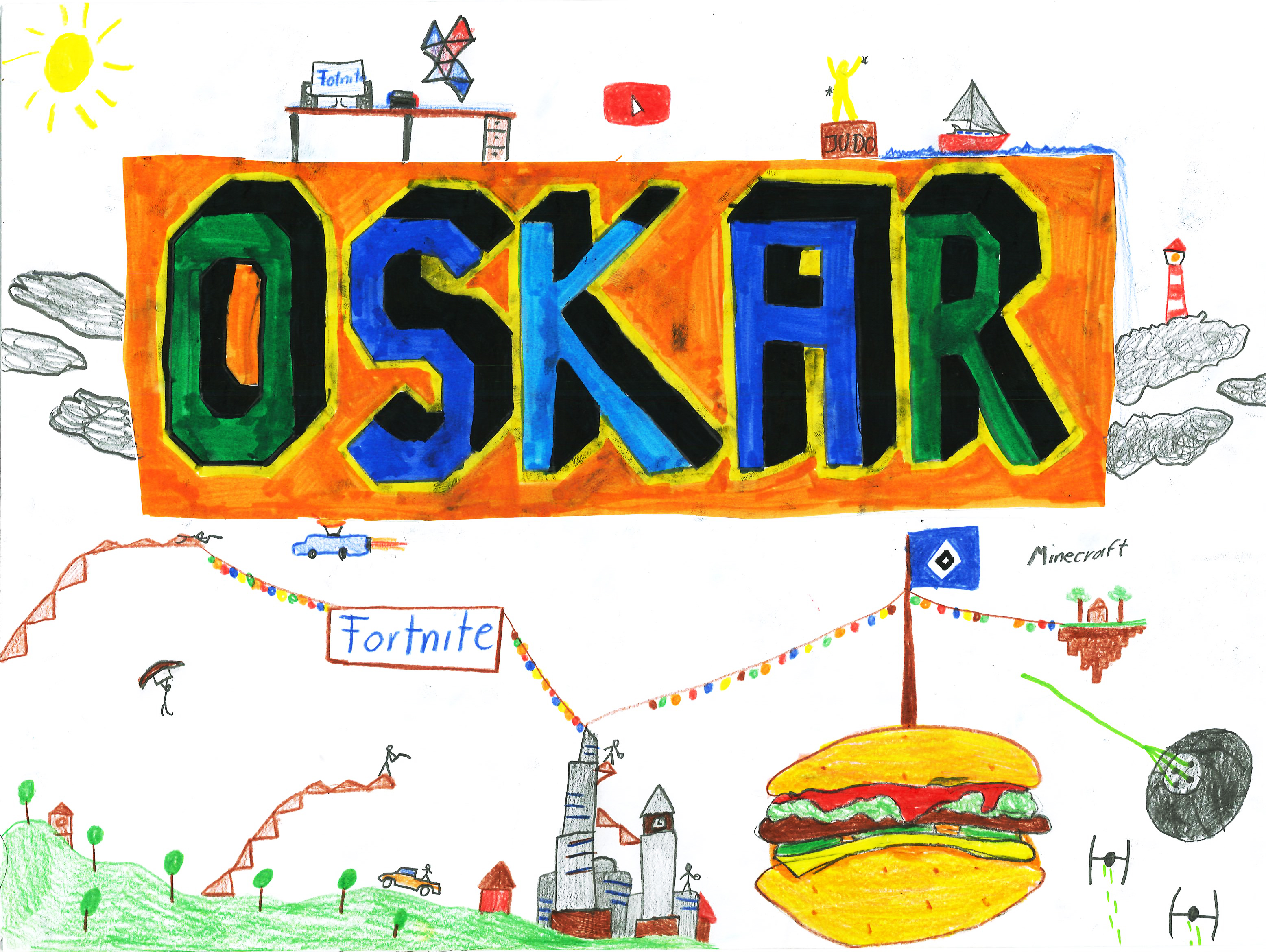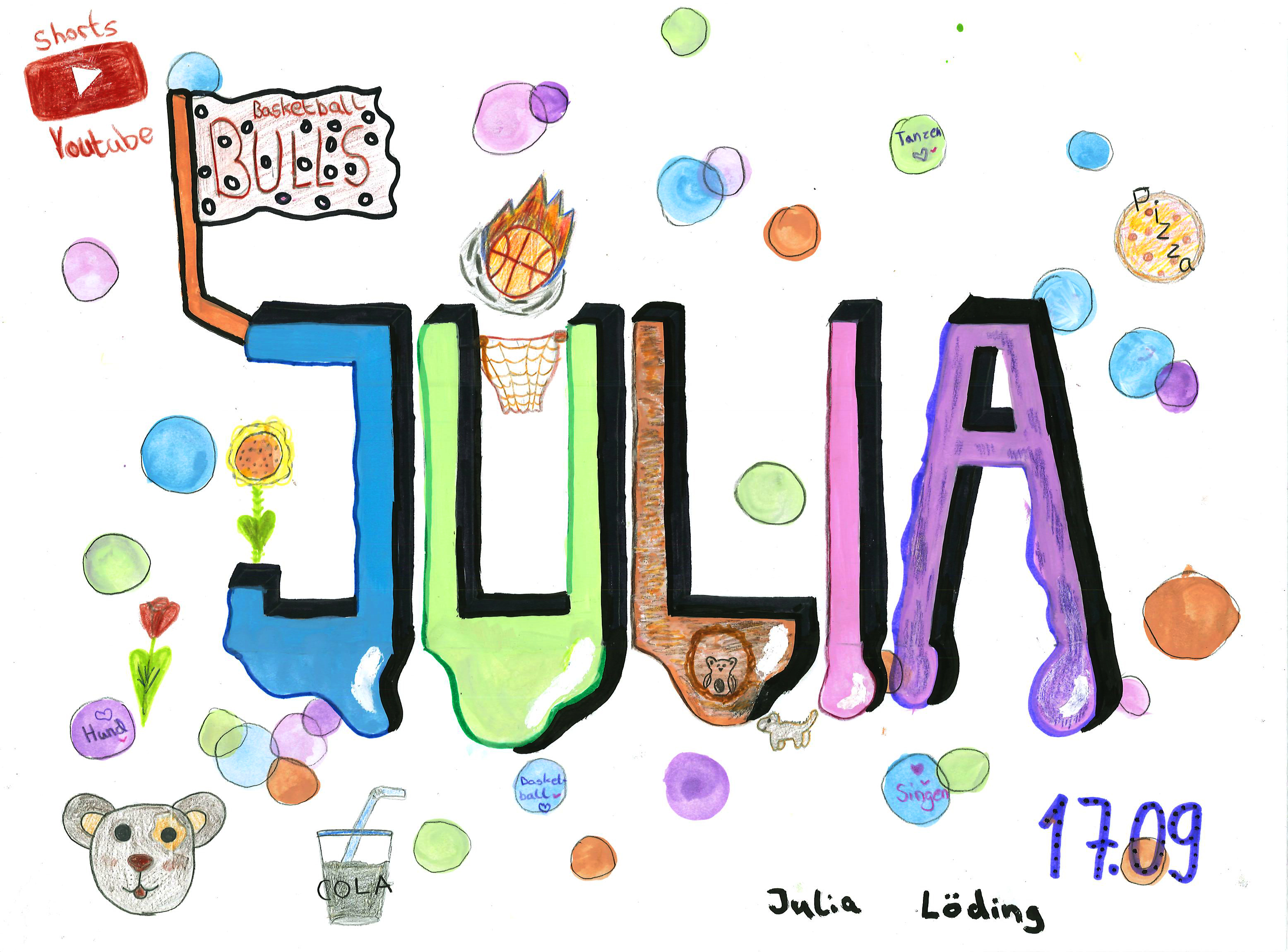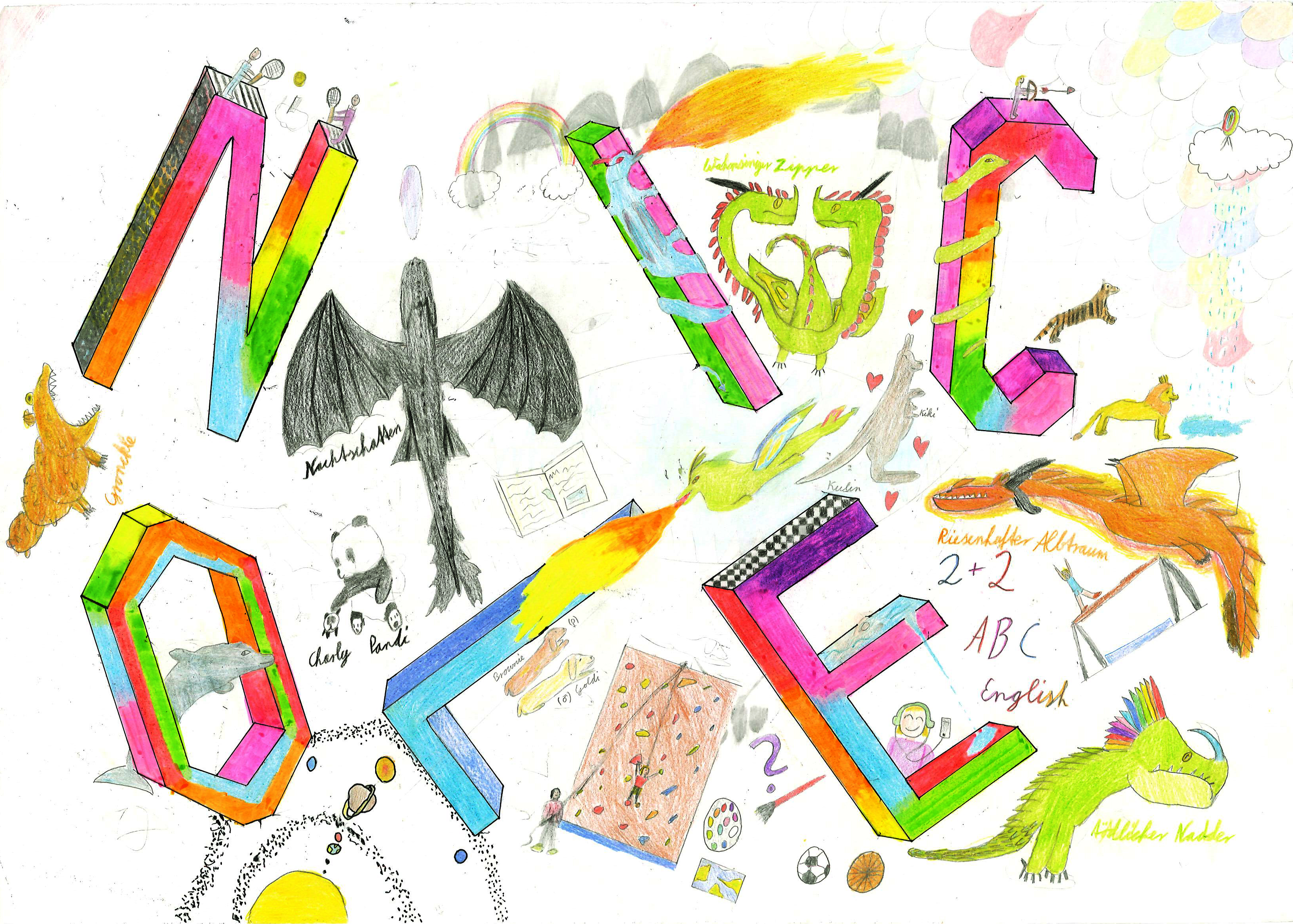Die Aufgabe im Kunstunterricht der Klassen 5c und 5d bestand darin, den eigenen Namen in Parallelperspektive zu konstruieren. Nachdem dies geübt wurde, haben die Kinder den Namen auf ein größeres Blatt übertragen. Dazu sollten ergänzend mindestens zwei Dinge gezeichnet werden, die die eigene Persönlichkeit ausmachen. Auch die Art und Weise der Darstellung gab Auskunft über den Charakter.