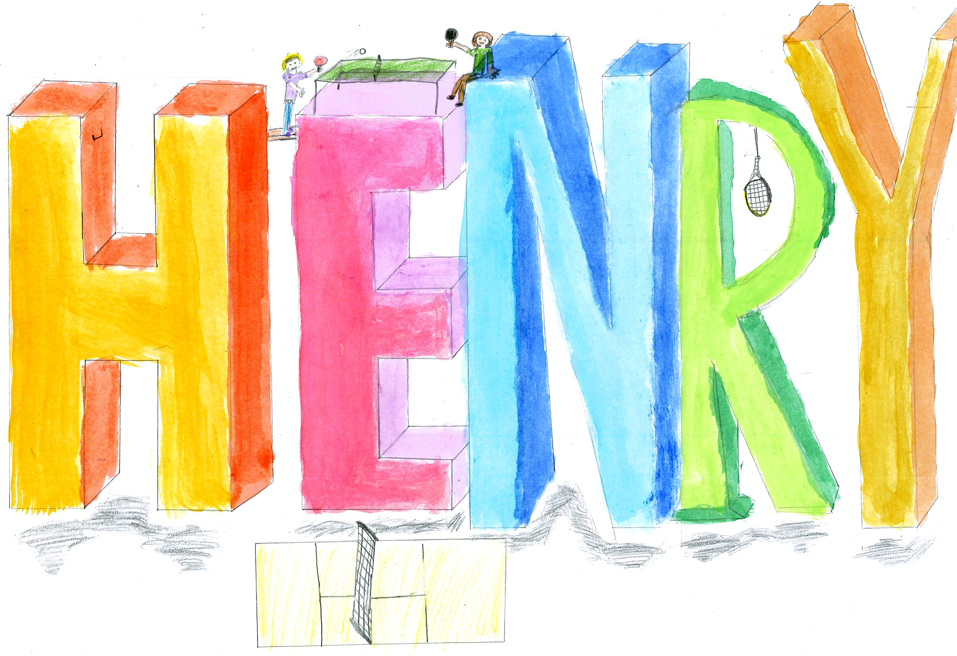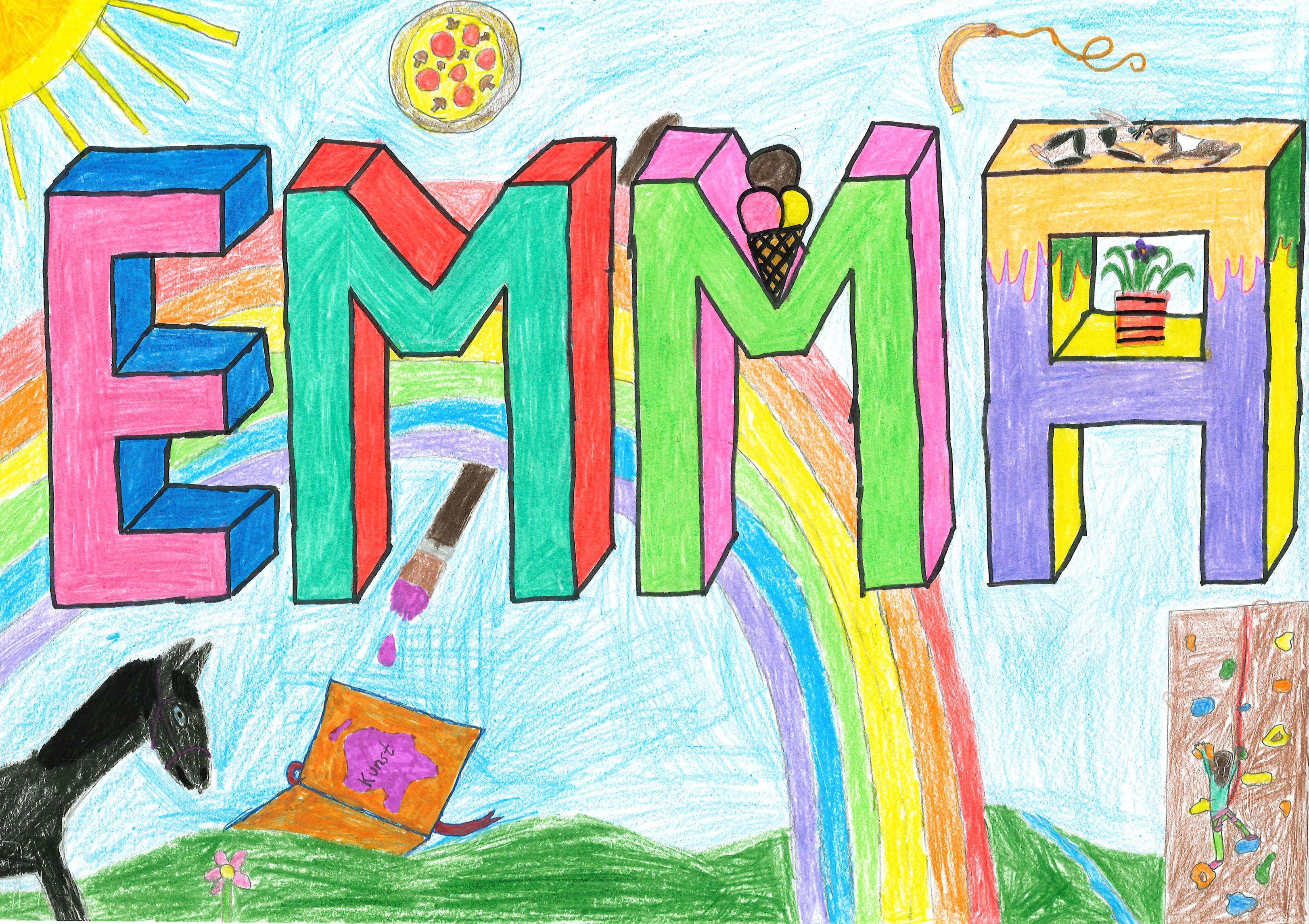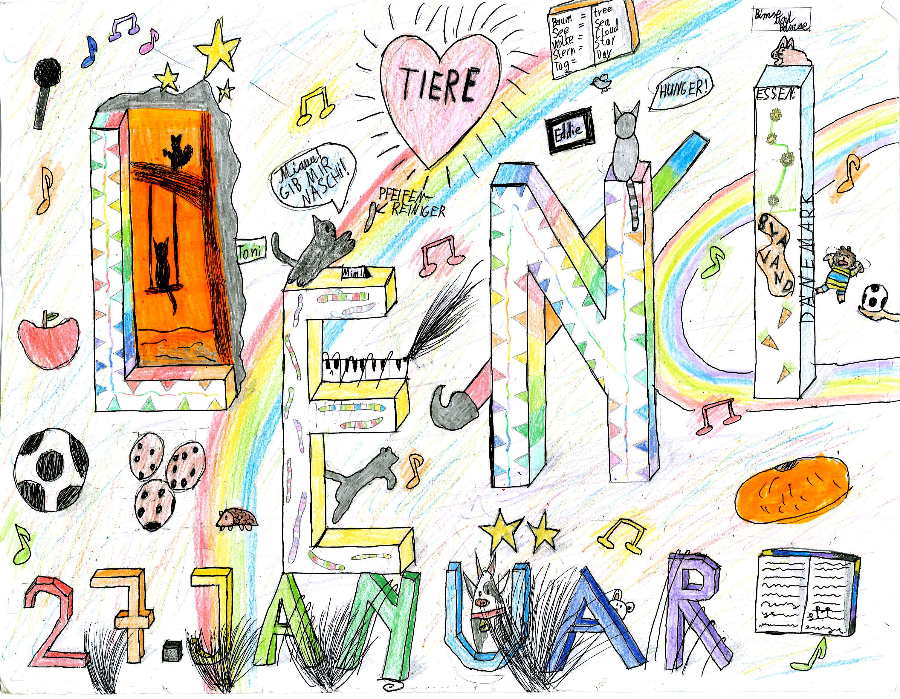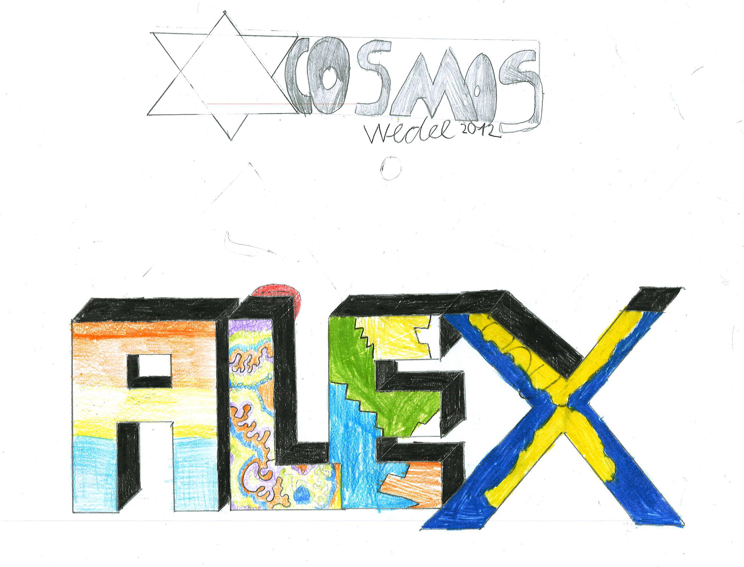 Die Aufgabe im Kunstunterricht der Klassen 5c und 5d bestand darin, den eigenen Namen in Parallelperspektive zu konstruieren. Nachdem dies geübt wurde, haben die Kinder den Namen auf ein größeres Blatt übertragen. Dazu sollten ergänzend mindestens zwei Dinge gezeichnet werden, die die eigene Persönlichkeit ausmachen. Auch die Art und Weise der Darstellung gab Auskunft über den Charakter.