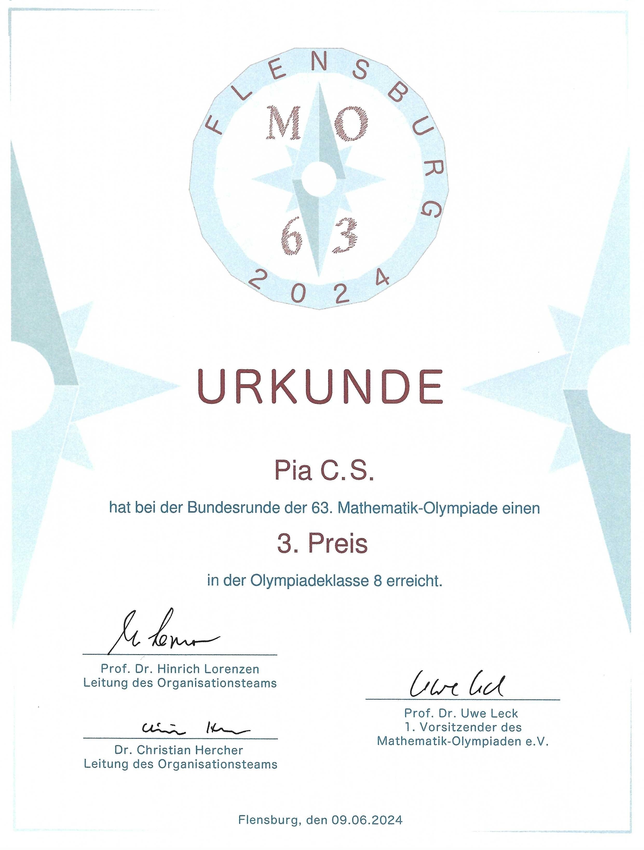 Pia S. (Kl. 8e) erhielt einen 1. Preis und konnte sich damit, wie bereits im letzten Schuljahr, für die Bundesolympiade qualifizieren (https://mo2024.de/).