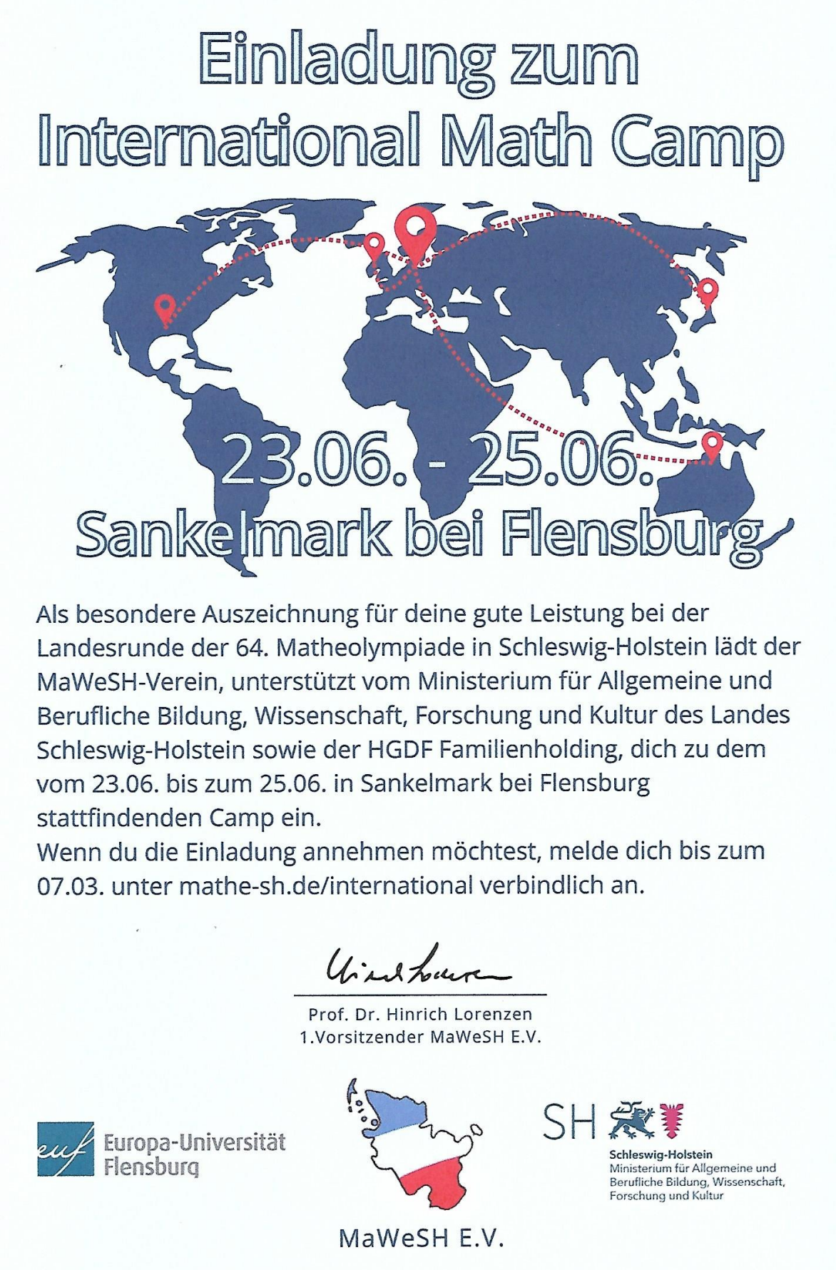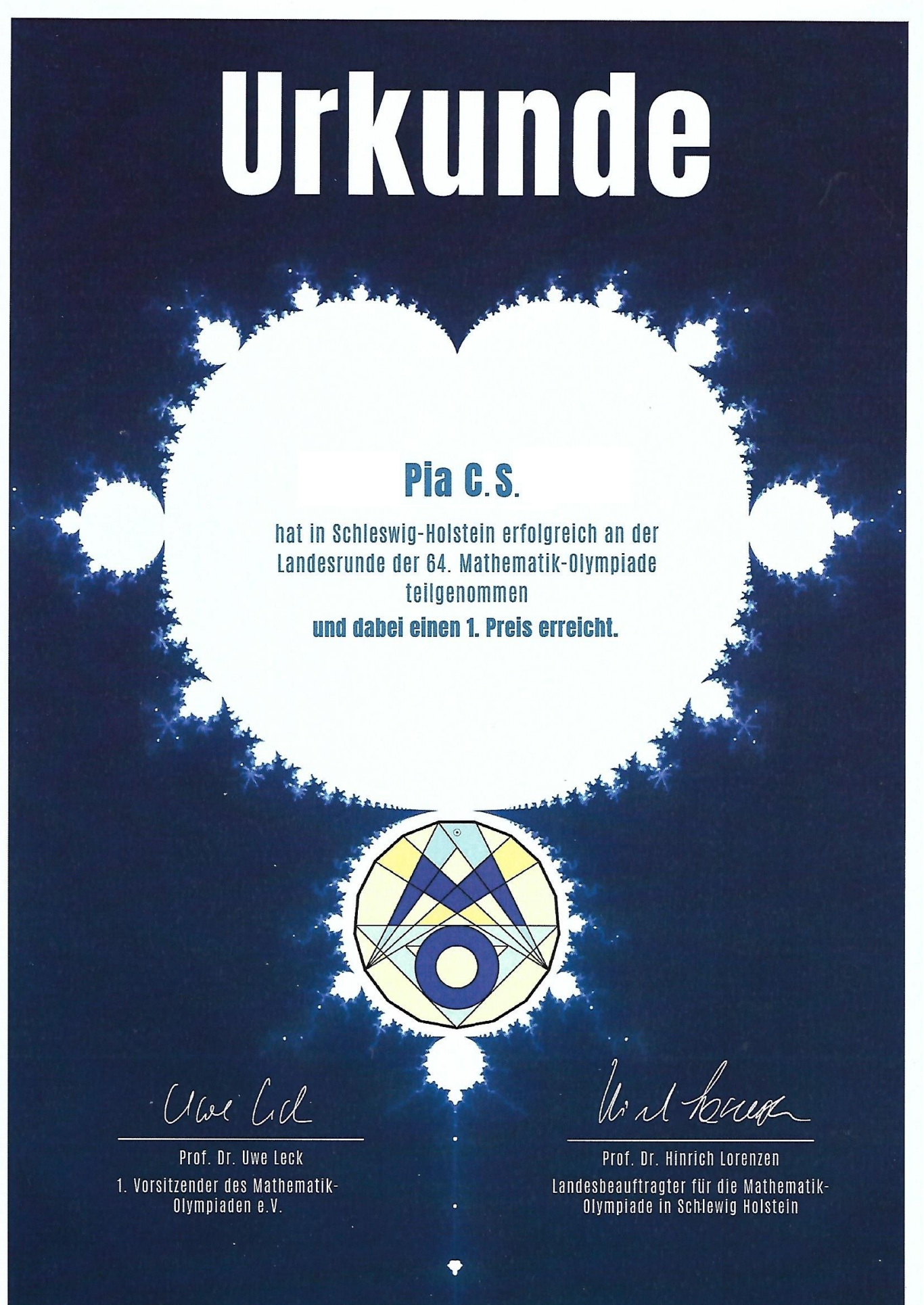 Pia Corazon S. (9e) hat wie im Jahr zuvor einen 1. Preis erhalten und sich damit auch wieder zur Bundesolympiade qualifiziert. Zusätzlich hat sie eine Einladung zum International Math Camp erhalten.