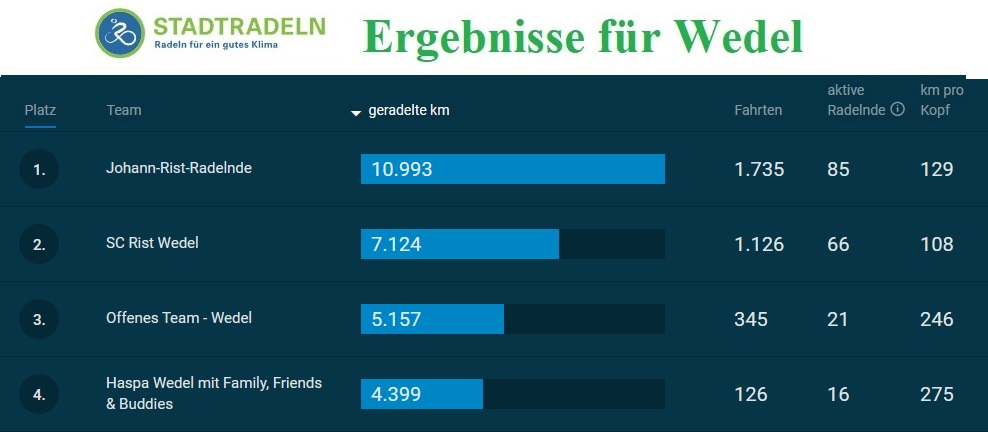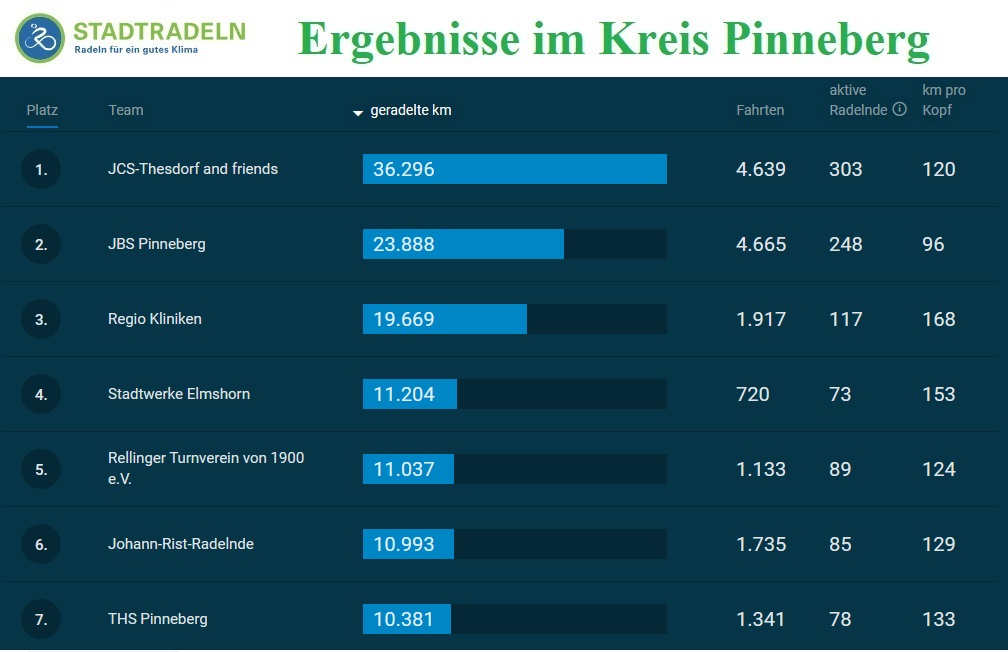 Das Team des JRG liegt mit fast 90 aktiven Radlern auf Platz 1 in Wedel und liegt damit auf Platz 6 im Kreis Pinneberg.