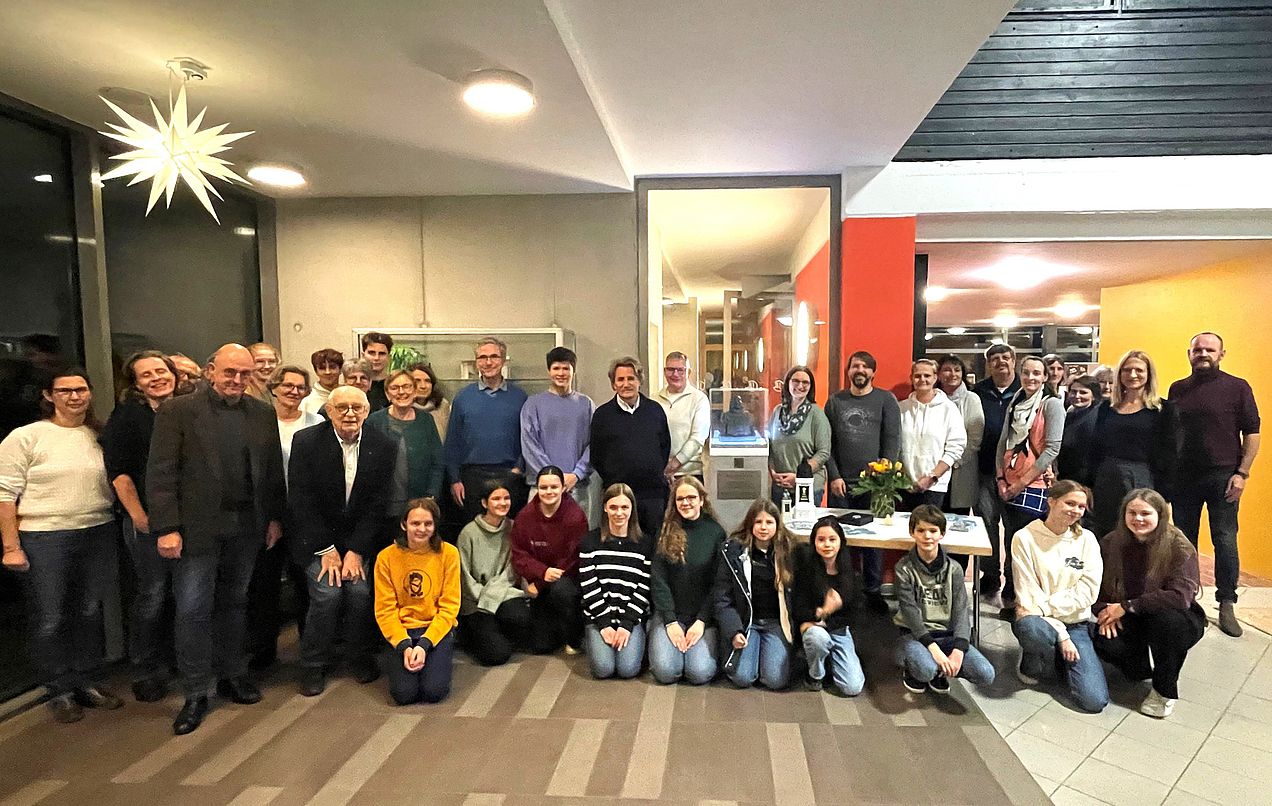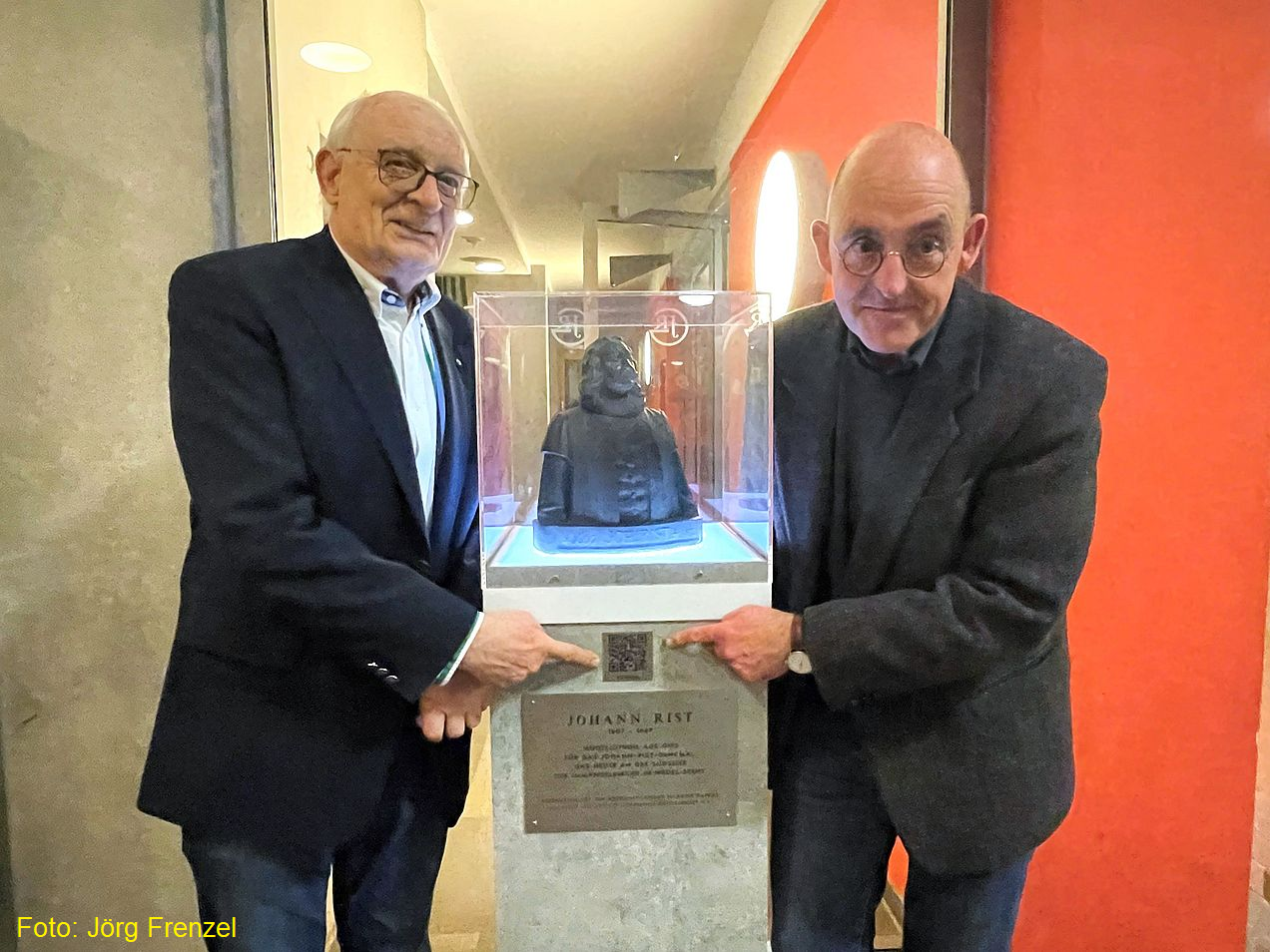 Der Startschuss wurde nun an der Schule abgegeben. An der verkleinerten Rist-Büste, die der Verein der Schule ausgeliehen hat, wurde nun ein QR-Code installiert, mit dem den Schülerinnen und Schülern - und allen anderen - auf leichte Art und Weise ermöglicht wird, Zugang zum Wissen über den Theologen, Pharmazeuten und Dichter und Journalisten und Botaniker und und und zu bekommen.