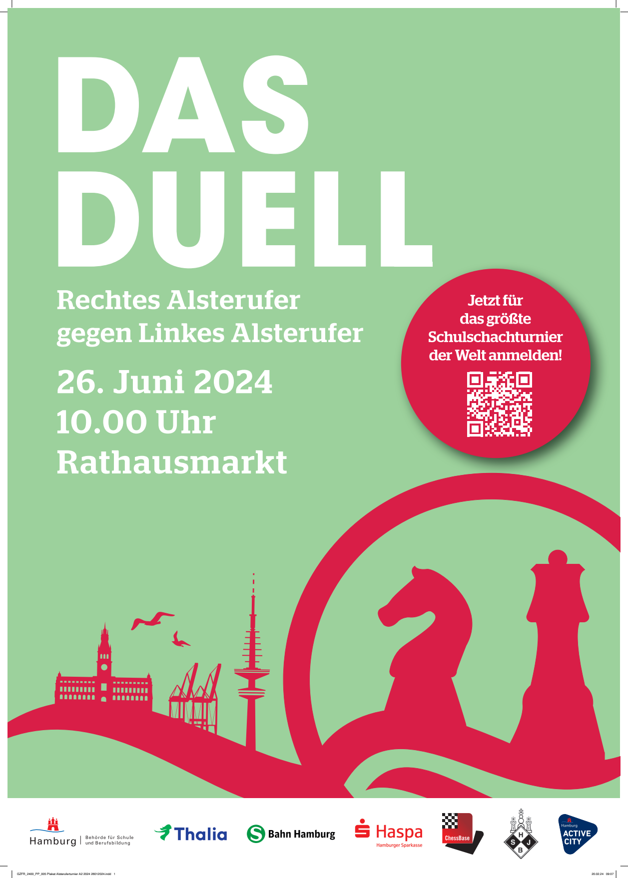 Am 26.06.2024 war es wieder soweit, das größte Schulschachturnier „Linkes gegen Rechtes Alsterufer“ fand auf dem Rathausmarkt Hamburg statt und unter freiem Himmel war das Turnier in diesem Jahr mit über 3700 Schülerinnen und Schülern noch ein bisschen größer als im letzten Jahr und komplett ausgebucht.