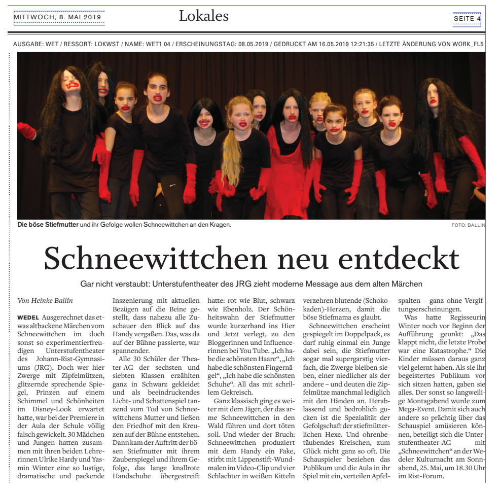 Zur Aufführung gab es folgenden Artikel von Heinke Ballin aus dem Wedel-Schulauer Tageblatt vom 08.05.2019: