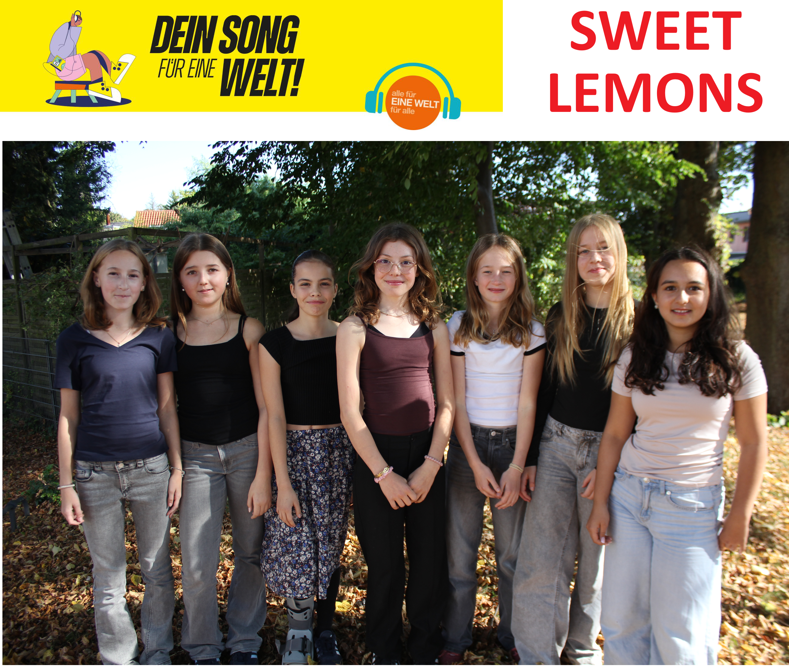 Die Sweet Lemons, Clara, Sophia, Aurélie, Merle, Lilli, Anni und Clara aus dem Jahrgang 7 vom Johann-Rist-Gymnasium aus Wedel haben es geschafft. Mit dem Song „Wieso???“ konnten sie die Jury des Song Contests „Dein Song für EINE WELT!“ überzeugen und sich einen Platz unter den diesjährigen Gewinner*innen sichern. Damit sind sie die einzige Schülerband aus Schleswig-Holstein, die es unter die 20 Finalist*innen geschafft hat.