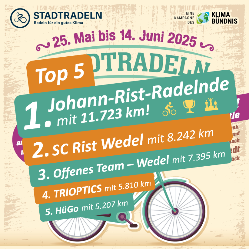 In diesem Jahr hat das STADTRADELN im Kreis Pinneberg inklusive Wedel vom 25. Mai bis 14. Juni stattgefunden. Wedel erradelte in diesem Jahr 82.732 km (~14t CO2) und landet damit im Kreis Pinneberg erstmalig wieder mit dem 2. Platz auf dem Treppchen. Die Johann-Rist-Radelnden sind auch in diesem Jahr in Wedel auf den 1. Platz geradelt und landen damit auf Kreisebene auf Platz 4.