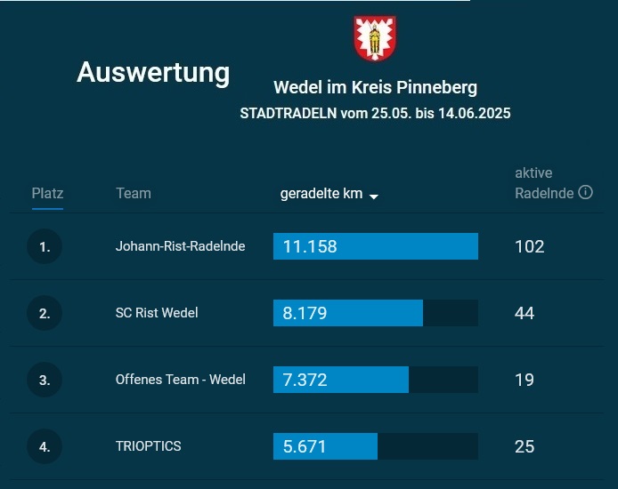 Im Kreis Pinneberg haben wir sowohl bei den geradelten Kilometern als auch bei der Anzahl der teilnehmenden Radler jeweils den 4. Platz erreicht. Das ist ein hervorragendes Ergebnis.