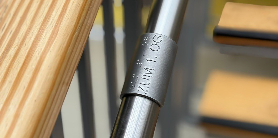 Treppensteigen mit mehr Sicherheit und Selbstständigkeit: Die 3-D gedruckten Handlaufmarkierungen an den Treppen sind sowohl mit Braille-Schrift als auch mit erhabener Profilschrift versehen. Sie erleichtern die Orientierung im Treppenhaus und tragen zu mehr Inklusion und Teilhabe im Alltag bei.