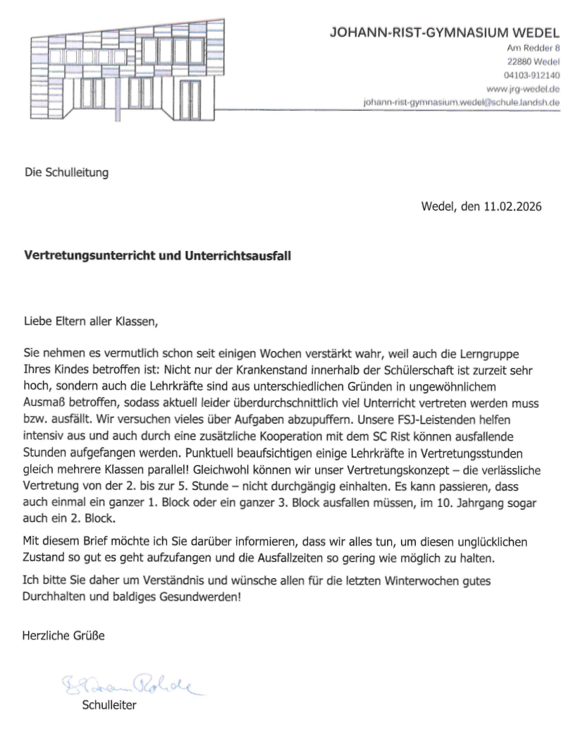Brief der Schulleitung zum Vertretungsunterricht und Unterrichtsausfall