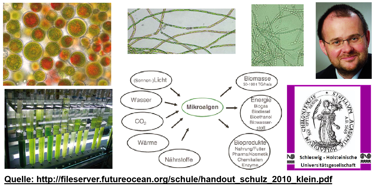 Zunehmend wird diskutiert, ob Mikroalgen und Cyanobakterien mit ihrer hohen Biomasseproduktion, der Möglichkeit zur Produktion von Biogas, Biodiesel, Bioethanol und Biowasserstoff, der Aufnahme von CO2 bei der Photosynthese und mit ihren wertvollen Inhaltsstoffen nicht Lösungen für einige unserer drängenden Klima-, Umwelt-, Energie-, Nahrungs- und Futtermittelprobleme bieten könnten. Daneben werden Mikroalgen zurzeit getestet, ob sie nicht im großen Umfang zur Wasserreinigung auf Kläranlagen, Aquakulturanlagen und Biogasanlagen eingesetzt werden können.