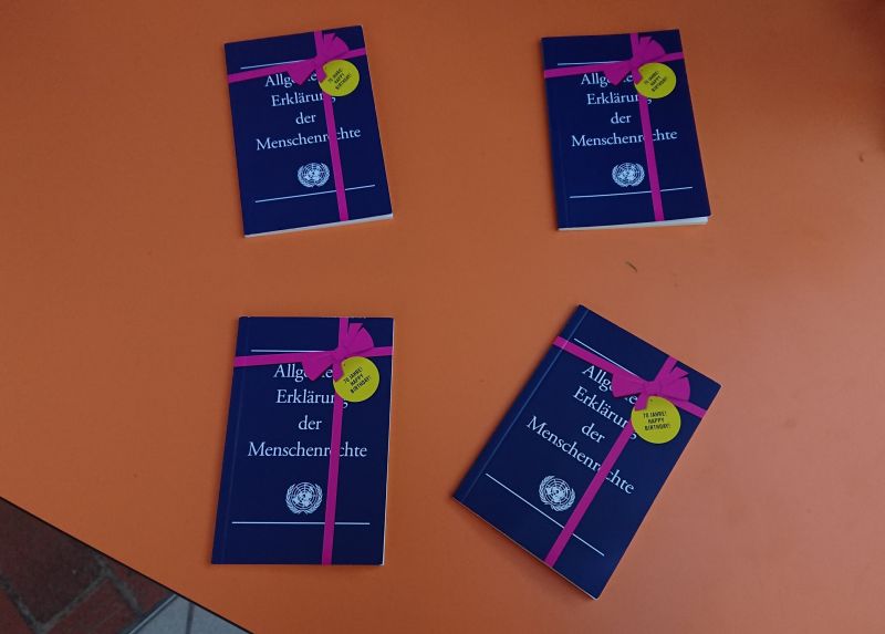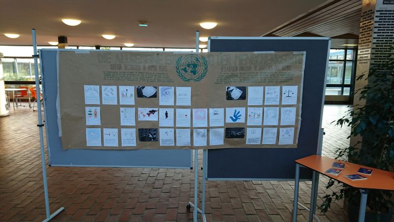 Im Zuge des Geschichtsunterrichts erstellte die Q1a während ihres Semesterthemas „Die Menschenrechte aus universal-historischer Perspektive – angeboren, egalitär, unteilbar und universell?“ und anlässlich des Jahrestages eine Wandzeitung. Diese Zeitung erinnert nicht nur an den 10.12.1948, sondern steht ebenso in Gedenken an Eleanor Roosevelt, die prägend in der Konzeption war.