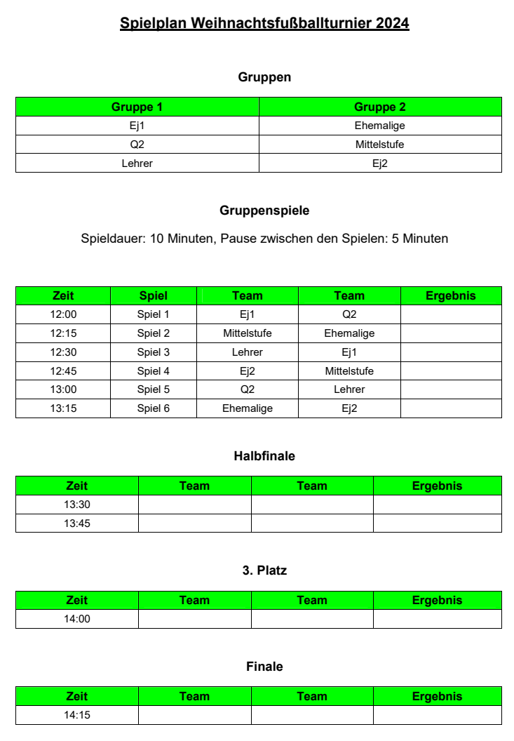 Am 18.12. findet nach Unterrichtsschluss das traditionelle Weihnachtsturnier zum Einstieg in die Weihnachtsferien statt. Das Turnier wird organisiert von der Schülervertretung des JRG.
