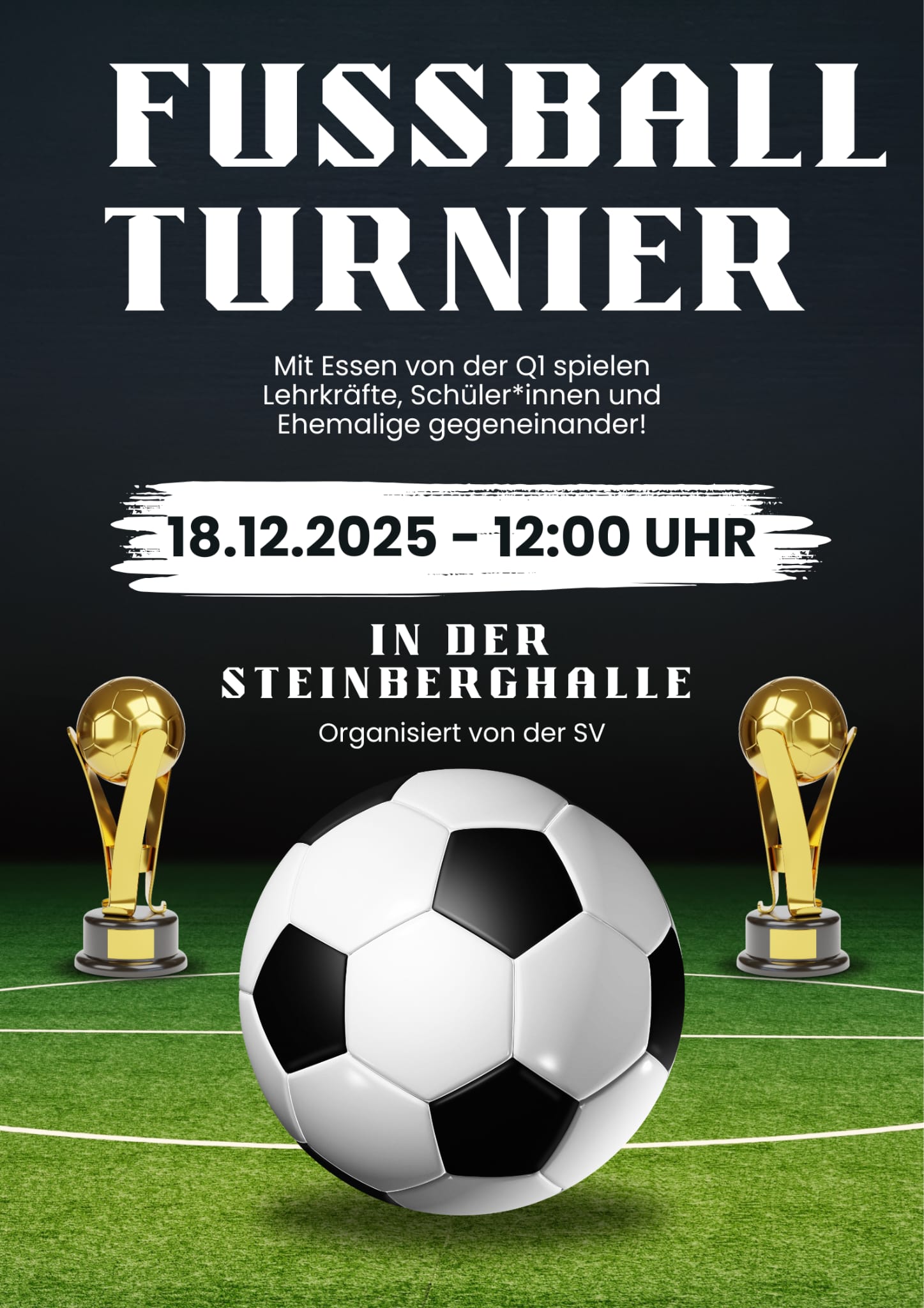 Am Donnerstag, den 18.12., ab der 5. Stunde (11:50) spielen in der Steinberghalle Schüler*innen der Jahrgänge 10, Ej, Q1, Ehemalige und Lehrkräfte gegeneinander.