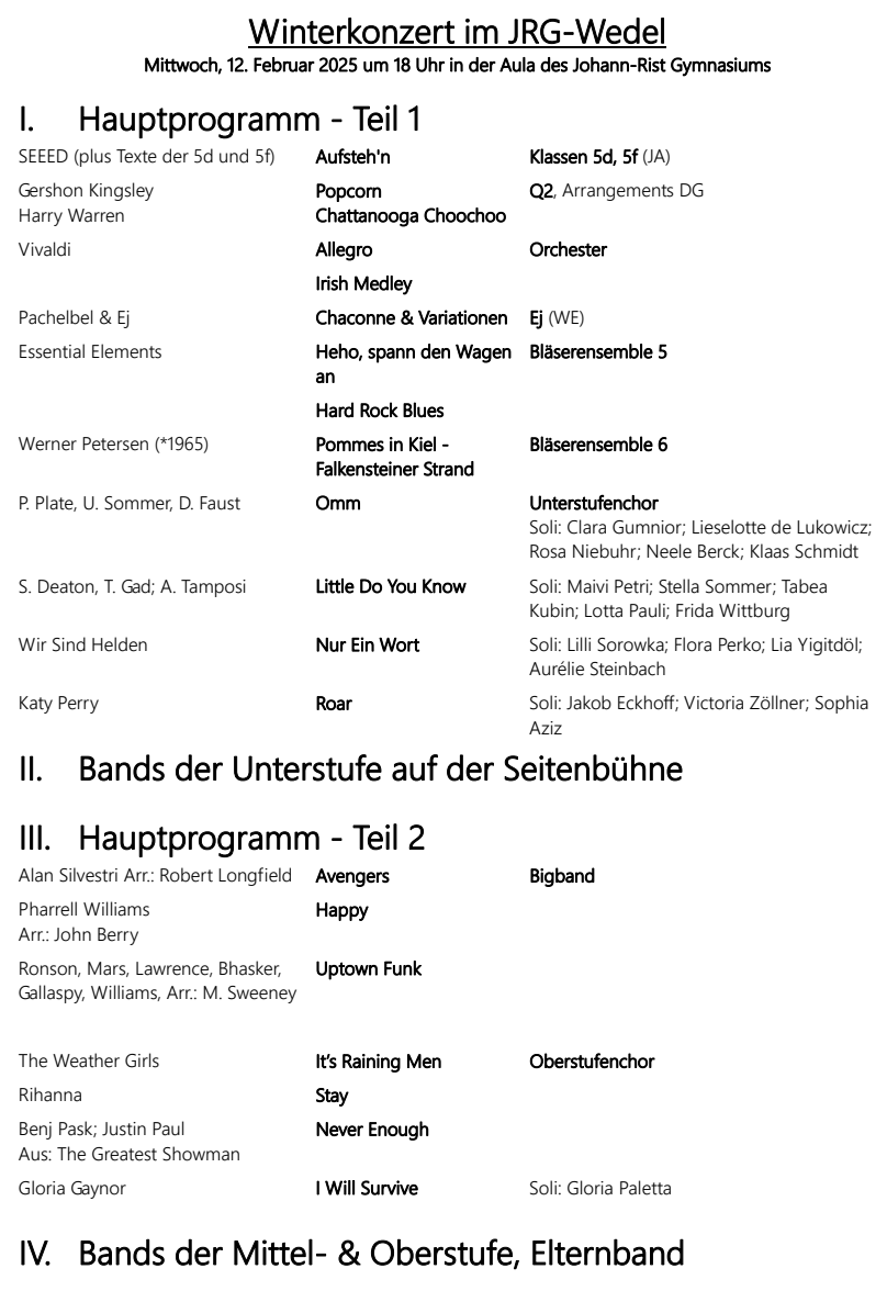 Am Mittwoch, den 12. Februar um 18:00 Uhr lädt die Musikfachschaft des Johann-Rist-Gymnasiums ein zu einem winterlichen Konzert in der Aula unserer Schule.
