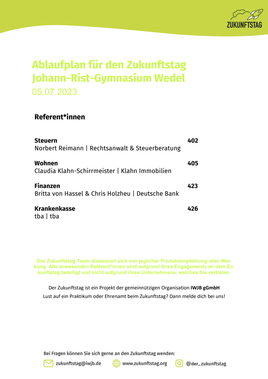 Schulverein des JRG ermöglicht den Zukunftstag für Ej-Klassen - Informationsveranstaltung zu Steuern, Wohnen, Finanzen und Krankenkasse
