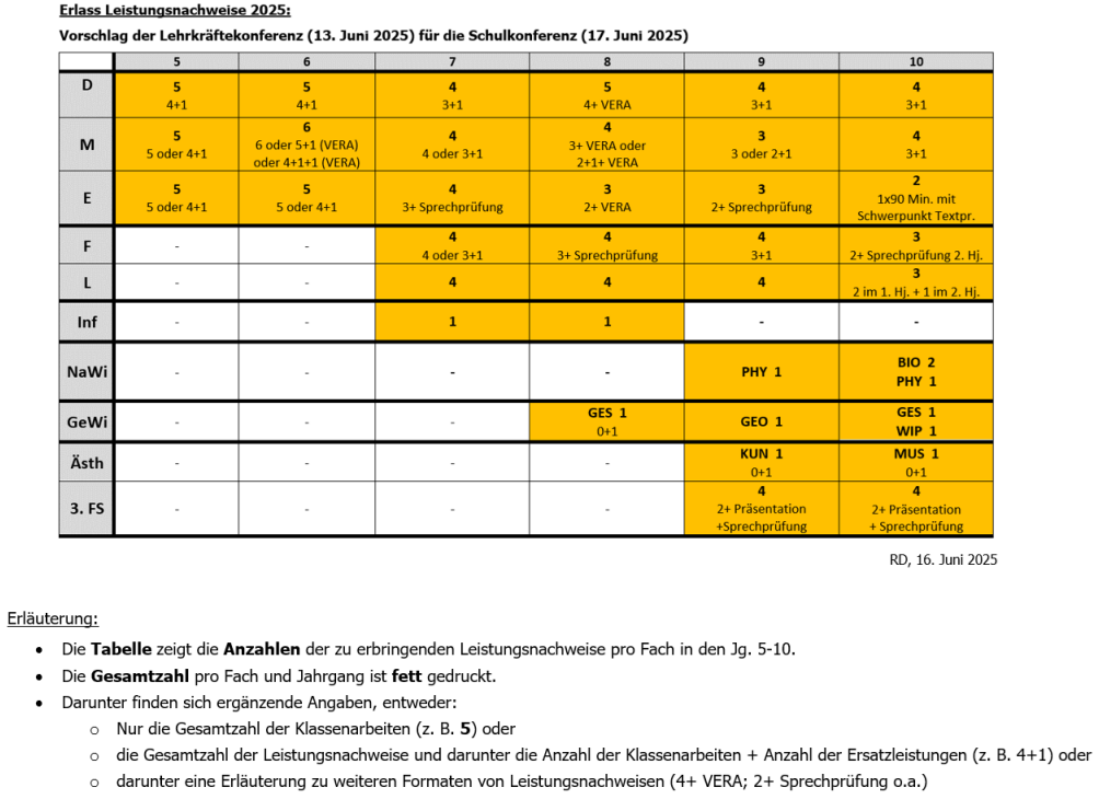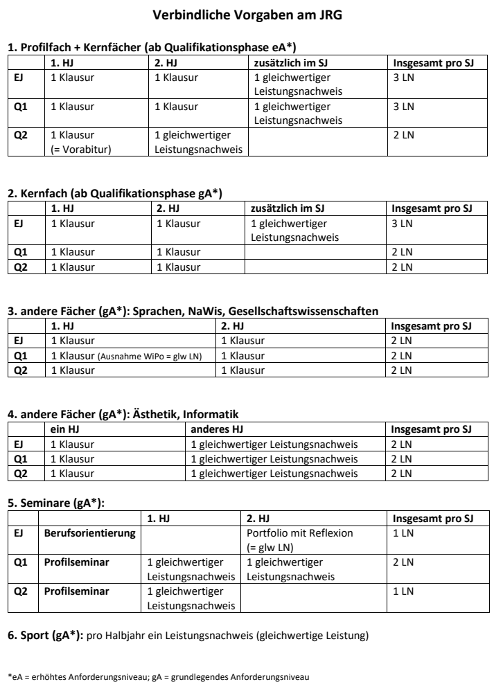 Die nachfolgenden Übersichten geben einen Überblick über die Leistungsnachweise, die in der Sekundarstufe I (Klassen 5-10) und der Oberstufe (Klassen Ej, Q1 und Q2) erbracht werden müssen. Ihr liegen die vom Ministerium vorgegebenen Bestimmungen zugrunde.